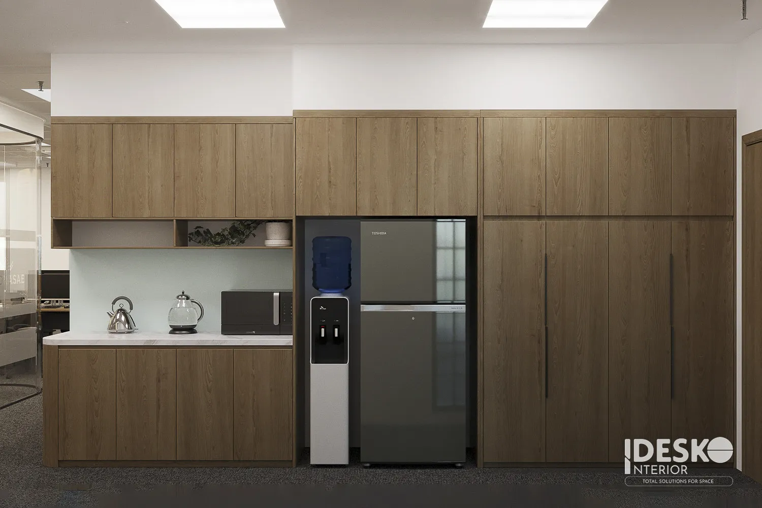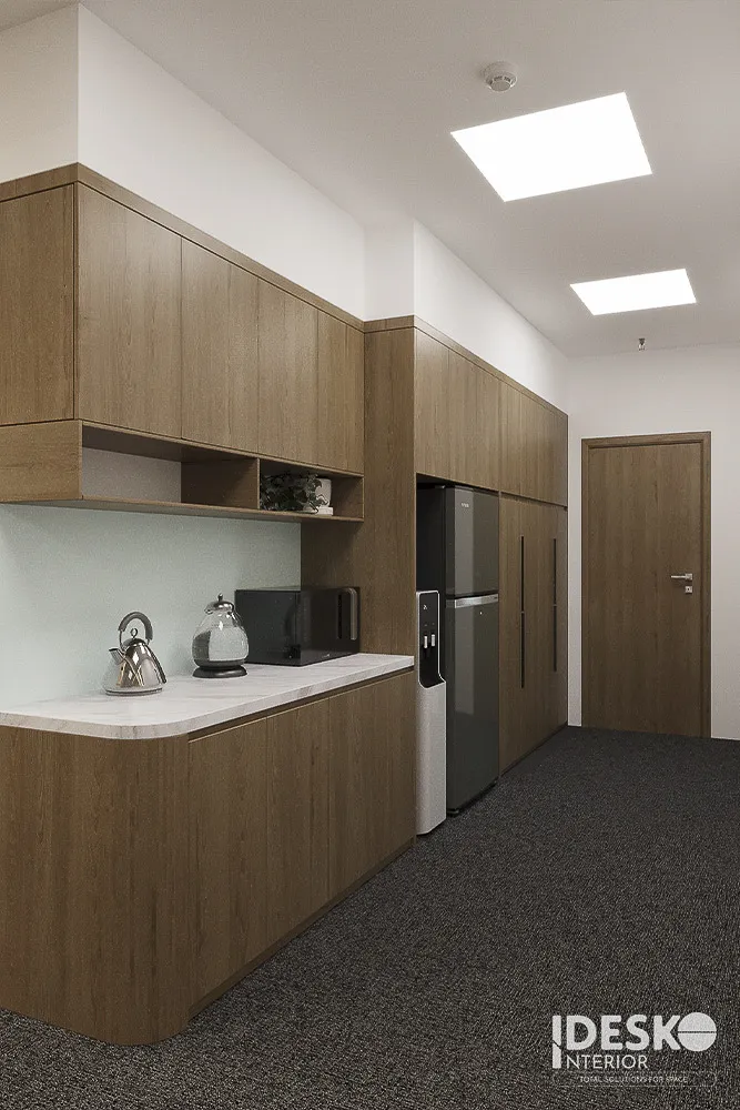 Pantry được thiết kế nhỏ gọn, hiện đại với hệ tủ gỗ công nghiệp phủ vân gỗ sang trọng. Không gian tích hợp đầy đủ tiện ích như tủ lạnh, máy lọc nước, lò vi sóng và ấm siêu tốc, đáp ứng nhu cầu sử dụng hằng ngày. Sự kết hợp giữa tone gỗ ấm áp và mặt bàn sáng màu tạo nên không khí thoải mái, mang đến cho nhân viên góc thư giãn và tái tạo năng lượng trong giờ làm việc.