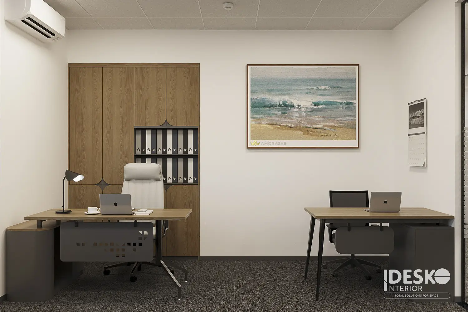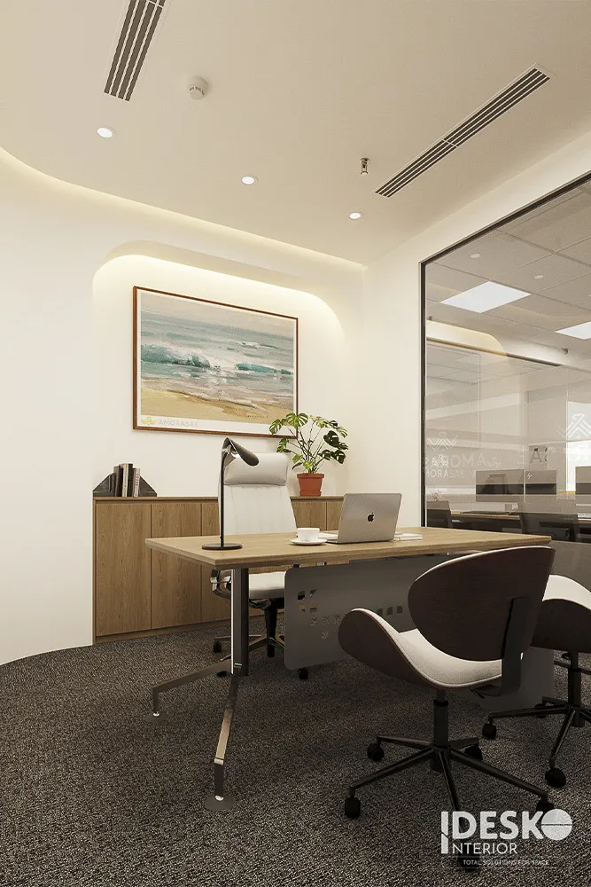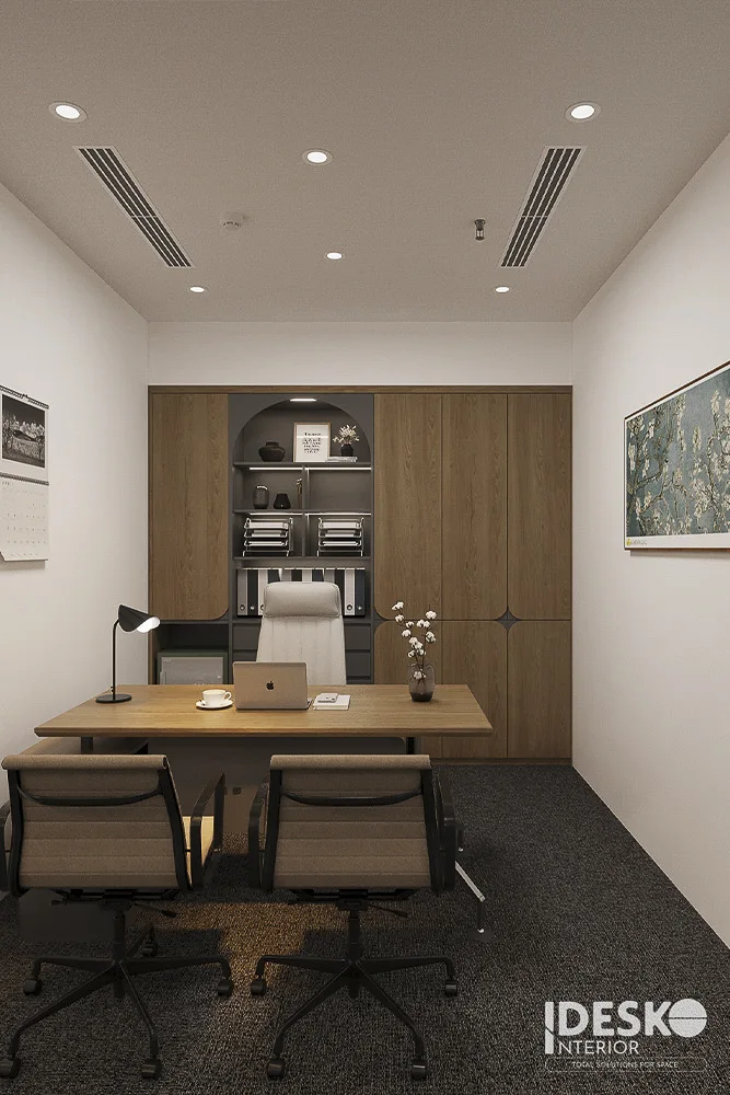 Phòng giám đốc được thiết kế sang trọng nhưng không quá phô trương. Bàn làm việc lớn kết hợp ghế da cao cấp cùng hệ tủ hồ sơ ốp gỗ vân tự nhiên, vừa đáp ứng công năng lưu trữ vừa tạo điểm nhấn thẩm mỹ. Tranh treo tường phong cảnh mang lại cảm giác thư giãn, đồng thời gợi nhắc đến lĩnh vực hoạt động của công ty.