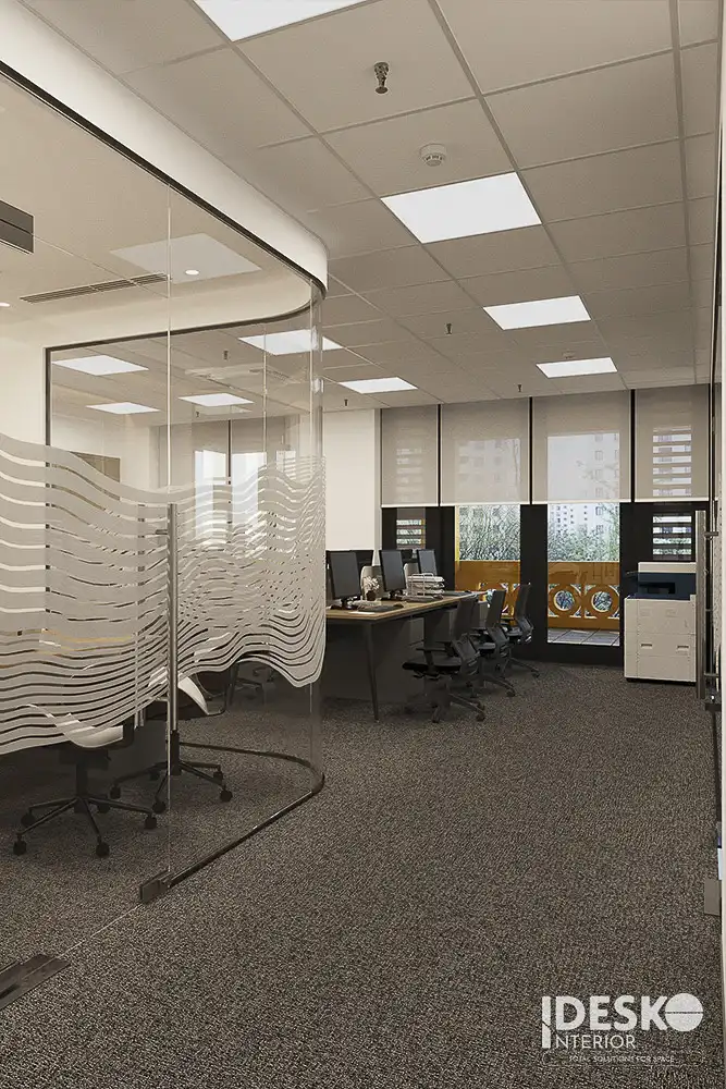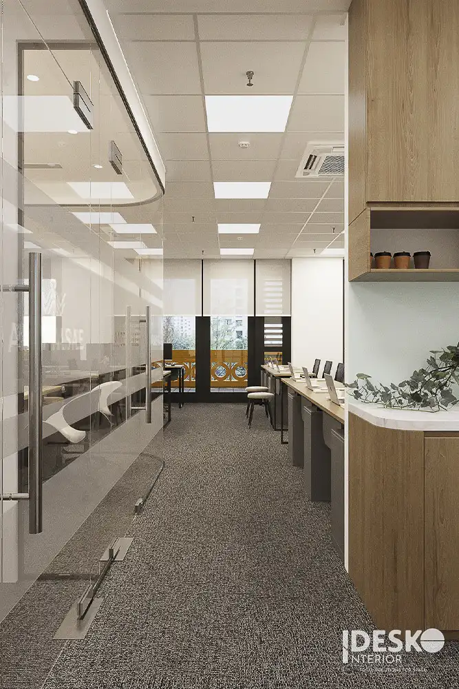 Hệ thống vách kính được bố trí linh hoạt, giúp tạo sự kết nối mở giữa các khu vực. Bố cục sắp xếp khoa học, thuận tiện cho làm việc nhóm nhưng vẫn giữ được tính riêng tư khi cần thiết, mang lại trải nghiệm làm việc cân bằng và hiệu quả.