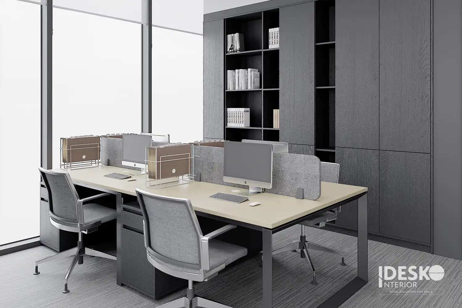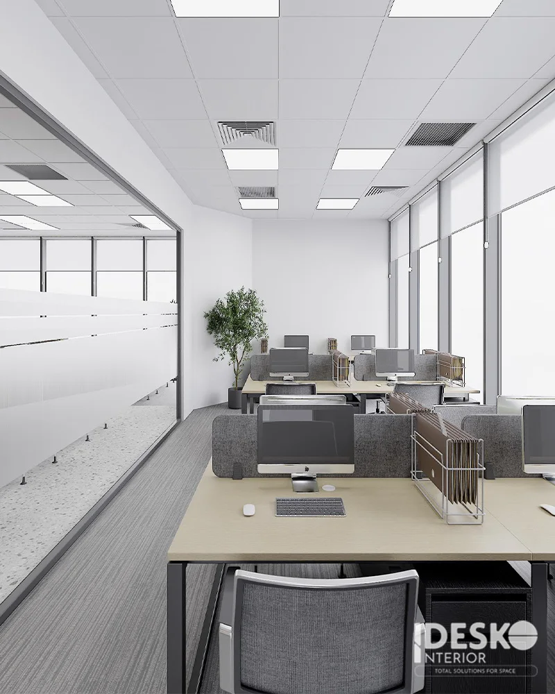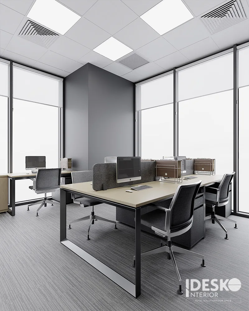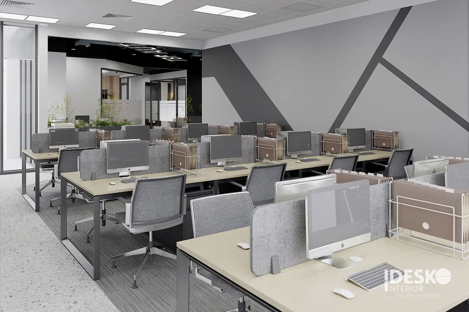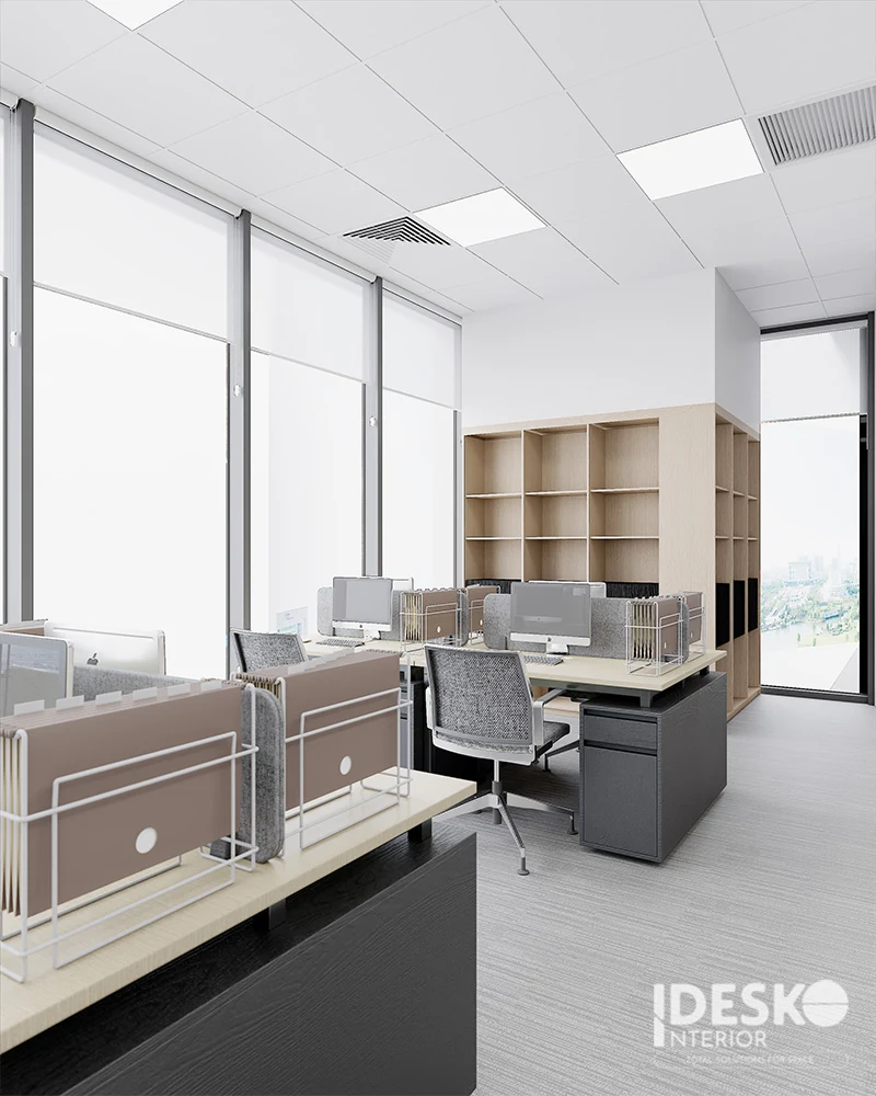 Cụm bàn sử dụng khung màu tối kết hợp mặt bàn màu gỗ sáng, đồng bộ với hệ tủ chân bàn và ghế xoay bọc nỉ xám. Vách ngăn bàn thấp bọc nỉ tạo ranh giới vừa đủ giữa các vị trí, giảm chói từ màn hình và hỗ trợ tiêu âm. Trên mỗi bàn làm việc, khay tài liệu và hộc tủ di động được tích hợp ngay từ đầu, giúp khu vực làm việc luôn ngăn nắp.