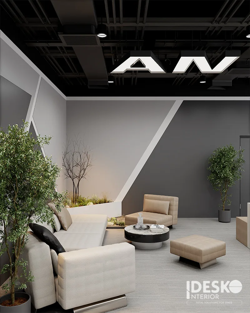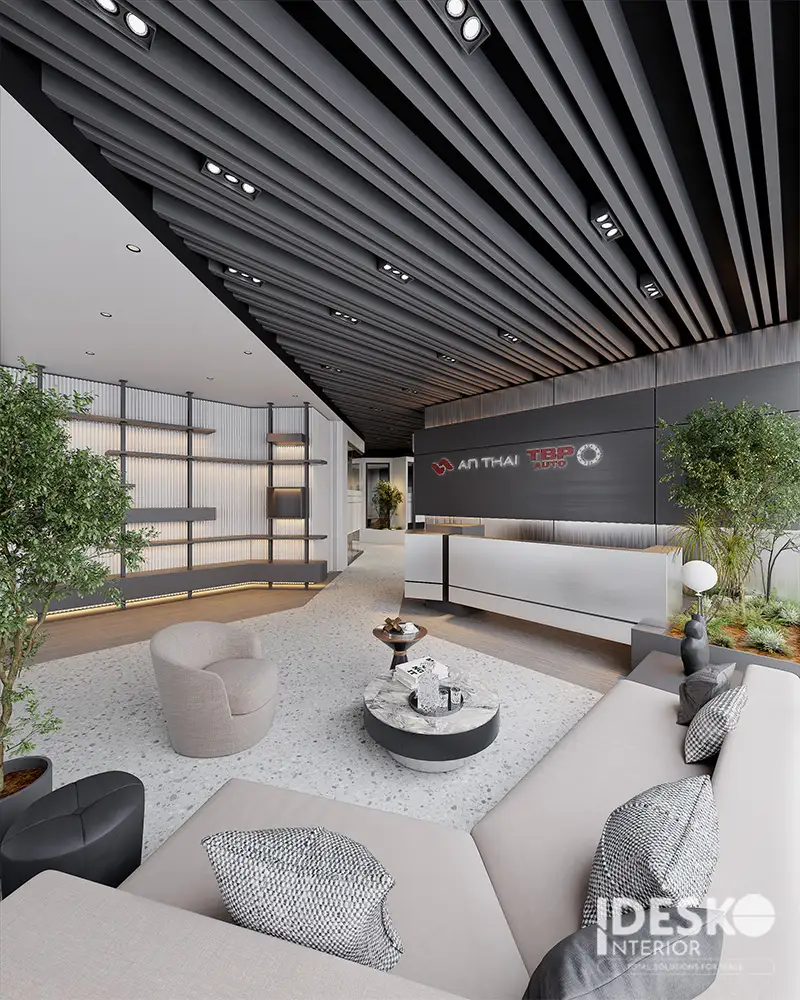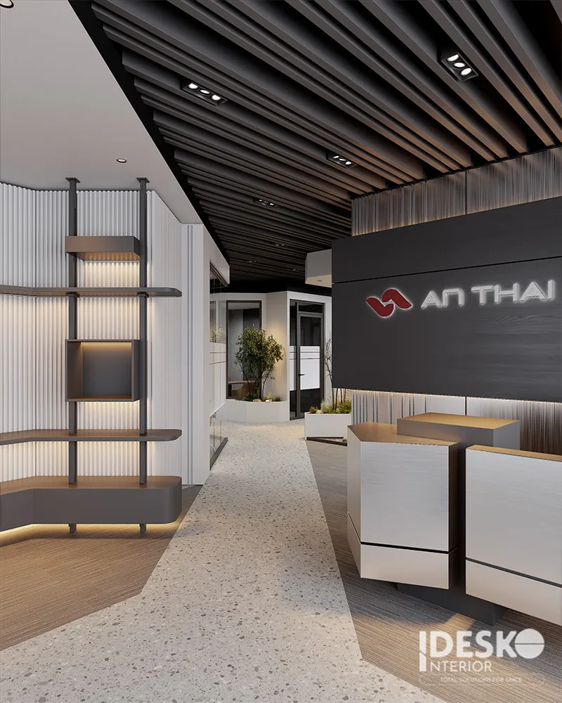 Khu sảnh trung tâm là không gian đầu tiên khách hàng nhìn thấy khi bước vào văn phòng An Thái. Thiết kế trần lam sơn đen chạy dọc tạo chiều sâu cho không gian và giúp giấu gọn hệ thống kỹ thuật. Dải đèn tên thương hiệu trên trần đóng vai trò như biển hiệu nội thất, định hướng giao thông và nhấn mạnh bản sắc thương hiệu.