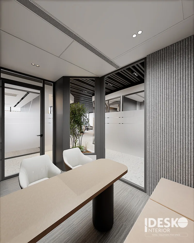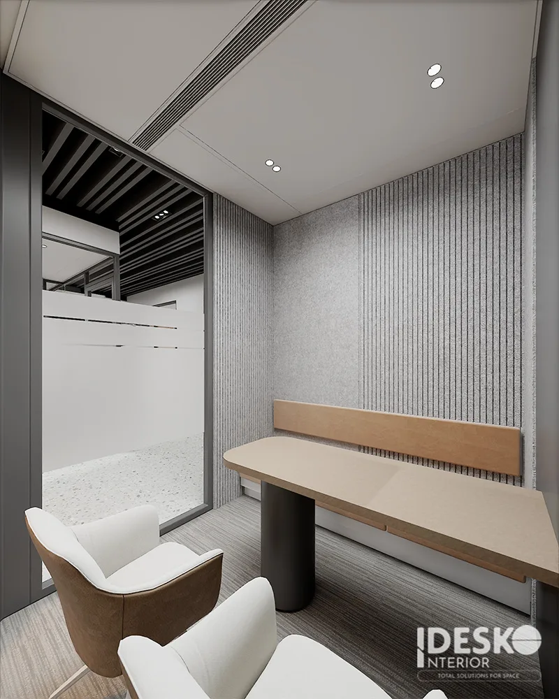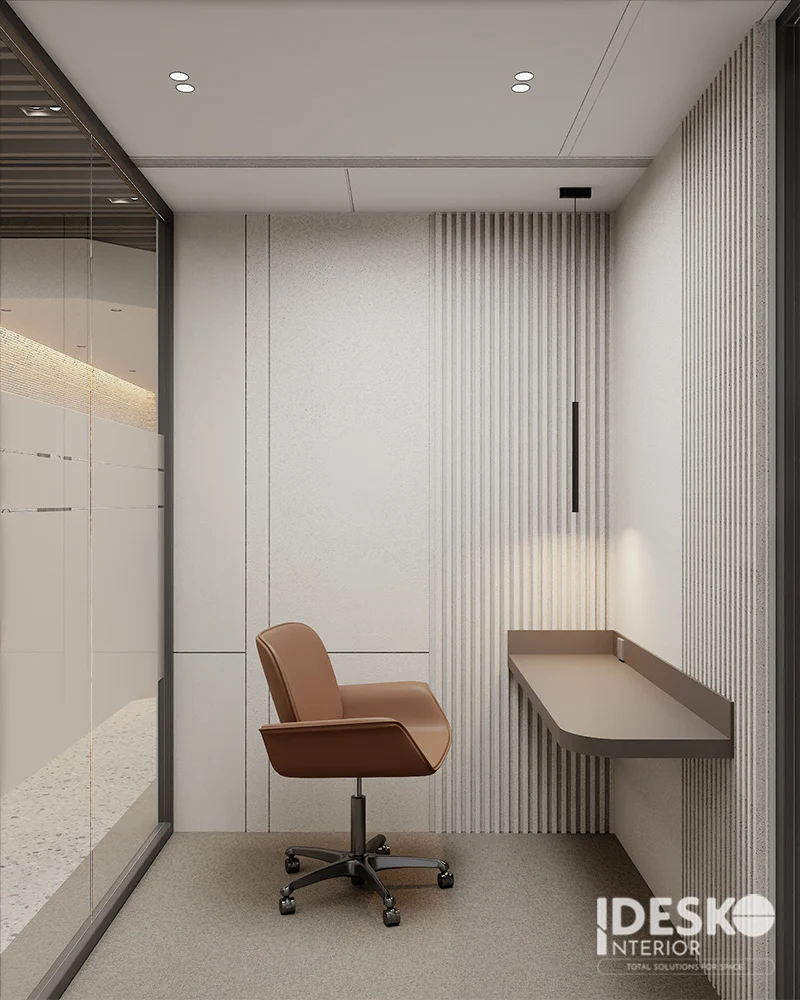 Song song với hệ phòng họp, văn phòng An Thái bố trí hai phone booth cho 1 – 4 người, sử dụng tường ốp gân dọc tiêu âm, bàn làm việc gắn tường và đèn chiếu tập trung. Đây là nơi nhân sự có thể gọi điện, họp online hoặc xử lý công việc cần độ tập trung cao mà không bị ảnh hưởng bởi tiếng ồn khu làm việc mở.