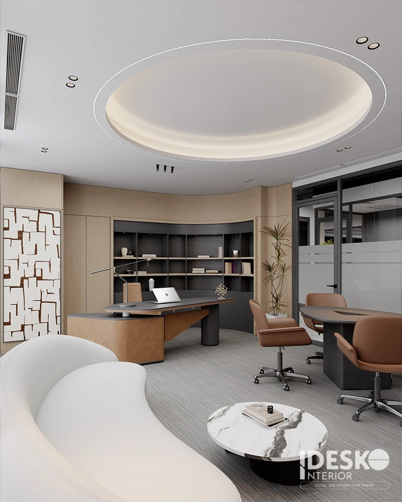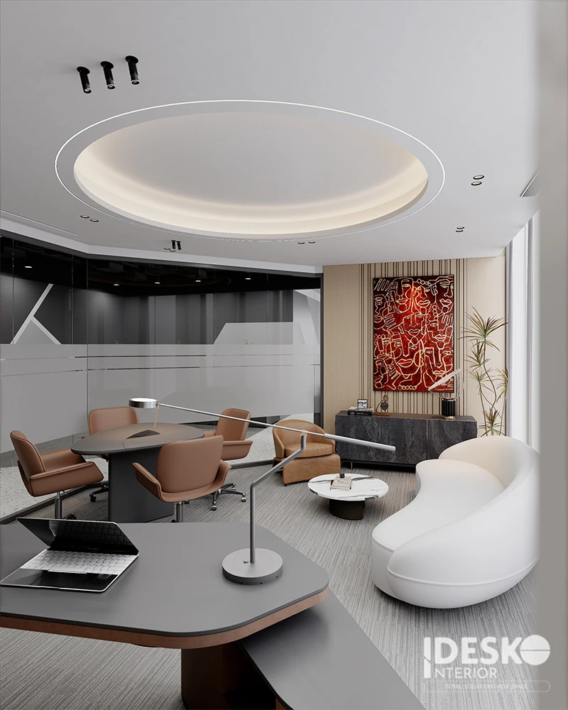 Phòng giám đốc dành cho lãnh đạo nữ mềm mại hơn với nhiều đường cong: trần bo tròn với dải đèn led ẩn, sofa cong màu trắng, bàn trà tròn và ghế bành êm ái. Tông màu beige – nâu – trắng kết hợp bức tranh nghệ thuật màu đỏ tạo điểm nhấn, vừa nữ tính vừa cá tính. Không gian phù hợp cho những buổi trao đổi chiến lược, gặp gỡ đối tác thân thiết.