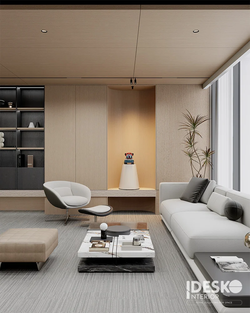 Nằm trên trục này là khu lounge trung tâm với các cụm ghế dài, ghế đôn và bàn thấp bố trí thành từng nhóm nhỏ. Không gian đóng vai trò là điểm dừng chân trước khi vào khu làm việc, phòng họp hoặc khu lãnh đạo. Đây cũng là nơi chờ khách, chờ họp hoặc trò chuyện nhanh giữa các bộ phận mà không cần sử dụng phòng họp riêng.