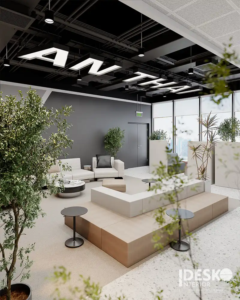Thiết kế trần mở sơn đen kết hợp hệ đèn gắn nổi và các dải chữ thương hiệu tạo ấn tượng mạnh ngay khi bước vào. Bên dưới là các bồn cây, tiểu cảnh khô và tông màu be, nâu của ghế ngồi giúp cân bằng cảm giác, giảm bớt sự nặng nề của mảng trần tối màu. Nhờ đó, khu lounge trung tâm vừa thể hiện tinh thần công nghiệp mạnh mẽ, vừa giữ được sự thân thiện và thoải mái cho người sử dụng.