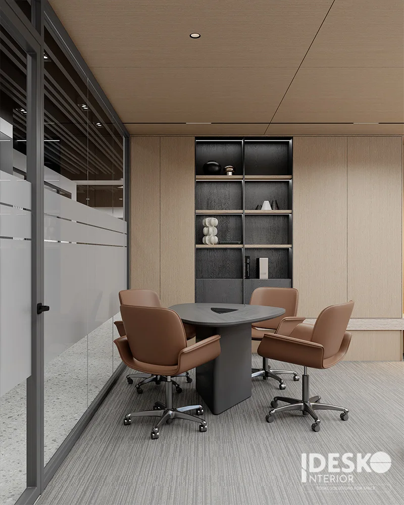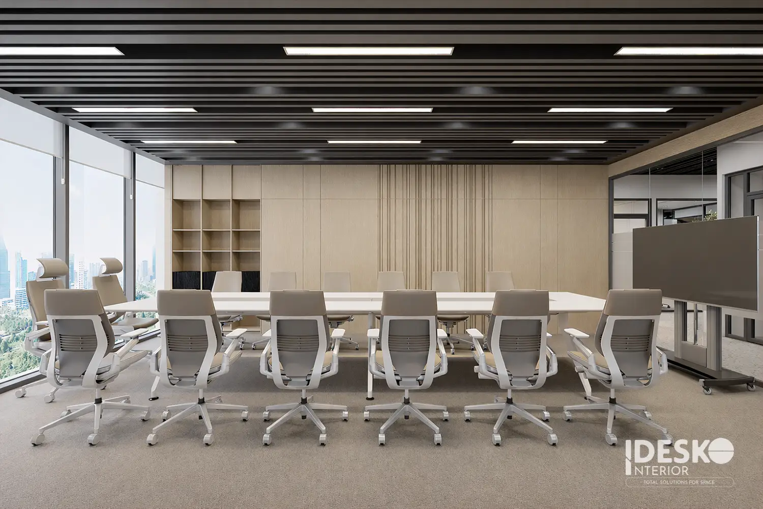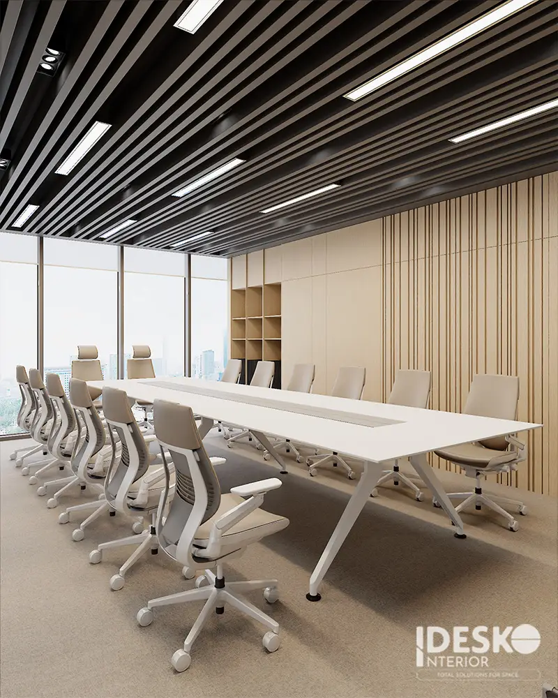Phòng họp lớn được đặt ở vị trí view kính rộng, đón ánh sáng tự nhiên với bàn họp dài và dãy ghế xoay công thái học hai bên. Mảng tường gỗ với các đường gân dọc và trần lam sơn đen tạo chiều sâu không gian, đồng thời là phông nền trang trọng cho các buổi họp chiến lược, tiếp khách và làm việc với đối tác.