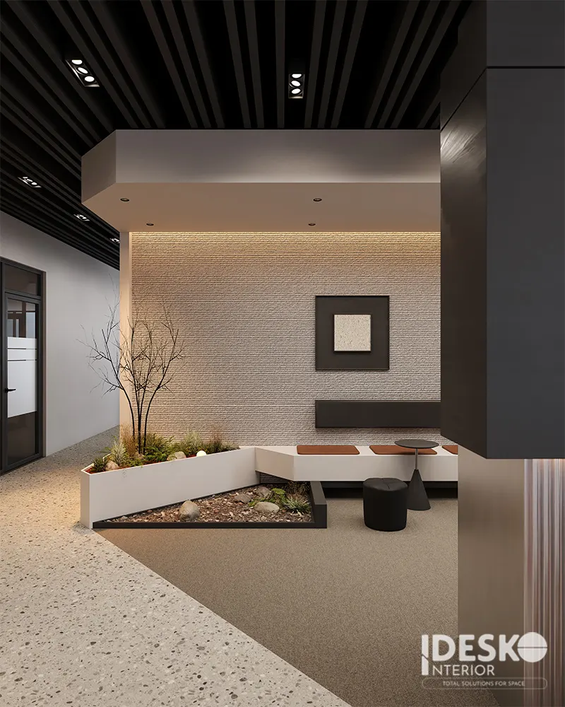 Sàn sử dụng sự chuyển tiếp giữa bề mặt đá và thảm trải sàn để phân tách luồng di chuyển và khu vực ngồi chờ. Băng ghế dài kết hợp đôn nhỏ và bàn trà bố trí dọc theo mảng tường, phù hợp cho khách ngồi chờ trong thời gian ngắn hoặc trao đổi nhanh giữa các nhóm. Các bồn cây bê tông tích hợp dọc hành lang vừa bổ sung yếu tố xanh, vừa tạo lớp đệm mềm giữa lối đi và các phòng chức năng xung quanh.