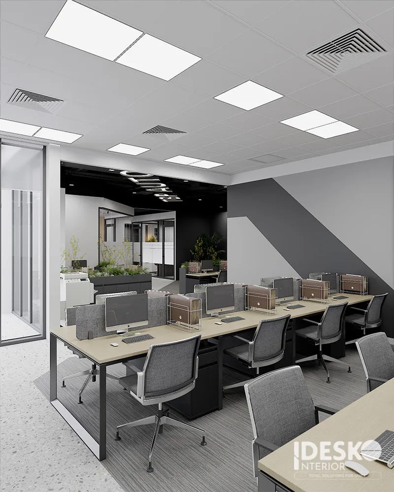 Phòng kế toán được bố trí như một không gian làm việc tách biệt, yên tĩnh hơn so với khu làm việc chung. Cụm bàn bốn chỗ với vách ngăn nỉ thấp hỗ trợ tập trung nhưng vẫn dễ trao đổi. Hệ tủ cao màu đen phía sau bàn hỗ trợ lưu trữ chứng từ. Tông màu xám kết hợp ánh sáng tự nhiên giúp không gian không bị nặng nề dù sử dụng nhiều chi tiết tối màu.