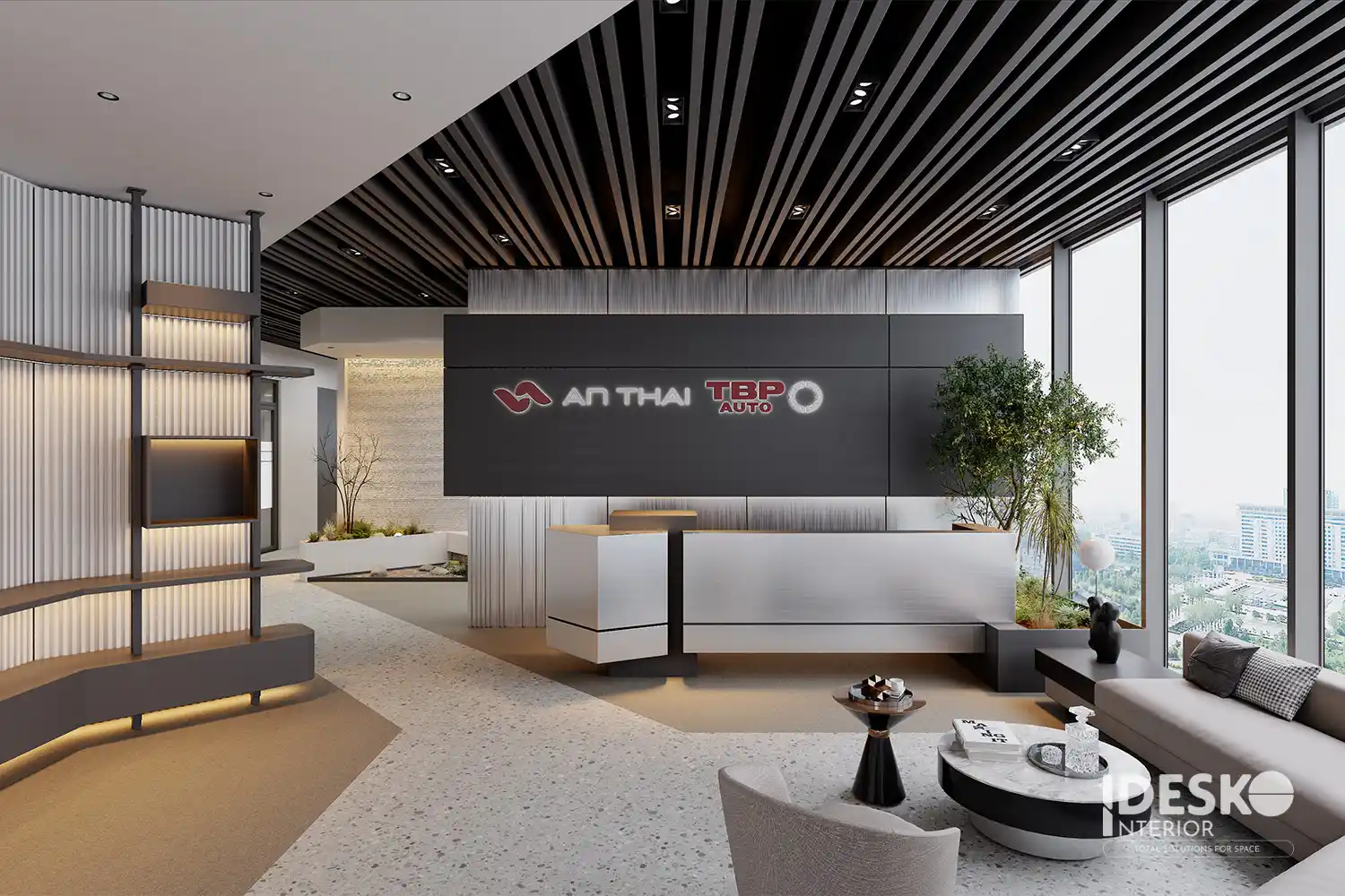 Phong cách chủ đạo của văn phòng An Thái là hiện đại pha nét công nghiệp, phù hợp với một doanh nghiệp hoạt động trong lĩnh vực cơ khí ô tô. Hệ trần mở sơn tối màu, để lộ đường ống kỹ thuật và dải đèn chạy dài tạo cảm giác mạnh mẽ và rõ ràng về cấu trúc. Các đường thẳng dứt khoát trên trần, tường và nội thất gợi liên tưởng tới chi tiết máy và kết cấu kỹ thuật trong ngành cơ khí.