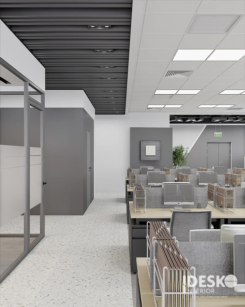 Sự phân tách chức năng được thể hiện tinh tế thông qua vật liệu và xử lý trần. Khu giao thông và lounge sử dụng trần sơn tối màu để nhấn mạnh trục di chuyển chính, trong khi khu làm việc và phòng họp dùng trần phẳng sáng màu nhằm tăng độ tập trung. Cách xử lý này giúp người dùng dễ dàng nhận diện từng khu vực mà không cần sử dụng nhiều vách ngăn cứng.