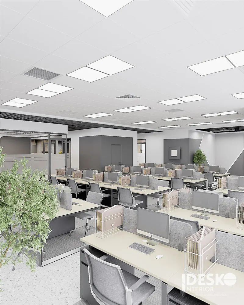 Phòng kinh doanh dùng cùng hệ bàn ghế và vách ngăn với khu kế toán, tạo sự đồng bộ về công năng và hình ảnh. Các dãy bàn được sắp song song theo chiều dài văn phòng, tận dụng tối đa ánh sáng từ vách kính và giữ lối đi thông thoáng để nhân sự dễ dàng di chuyển, trao đổi. Cây xanh được bố trí ở góc phòng giúp giảm bớt cảm giác khô cứng, hỗ trợ tái tạo năng lượng.