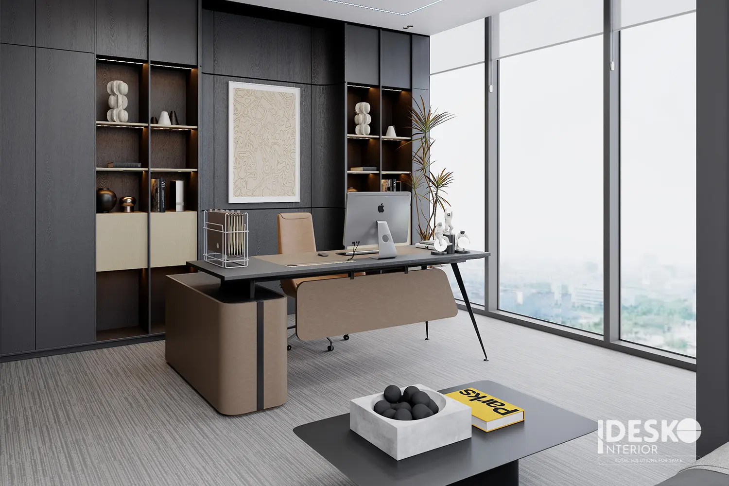 Phòng giám đốc còn lại có diện tích gọn nhưng rất gọn gàng và hiện đại. Bàn làm việc chân mảnh, mảng tường và tủ màu đen than được chia ô kệ trưng bày, kết hợp ánh sáng hắt trong kệ tạo chiều sâu. View kính rộng mở giúp không gian luôn thoáng và sáng, đồng thời giữ được sự riêng tư cần thiết cho lãnh đạo.