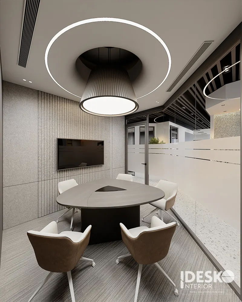 Phòng họp nhỏ nằm ngay cạnh trục giao thông trung tâm, được bao quanh bởi vách kính trong suốt với decal mờ để đảm bảo riêng tư. Bàn họp hình tam giác bo tròn, ghế bọc da êm ái và hệ đèn thả lớn kết hợp vòng sáng tròn trên trần tạo cảm giác tập trung, hiện đại, phù hợp cho các cuộc họp nhanh 4 – 6 người.