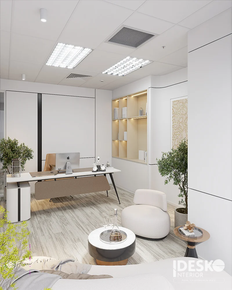 Phòng giám đốc là không gian quan trọng trong văn phòng Khải Việt, vừa phục vụ công việc của lãnh đạo, vừa là nơi tiếp đón khách hàng. Idesko chia căn phòng thành hai khu chức năng gồm khu bàn làm việc và khu sofa tiếp khách. Cách phân chia này giúp việc sử dụng phòng trong thực tế rõ ràng và linh hoạt hơn.