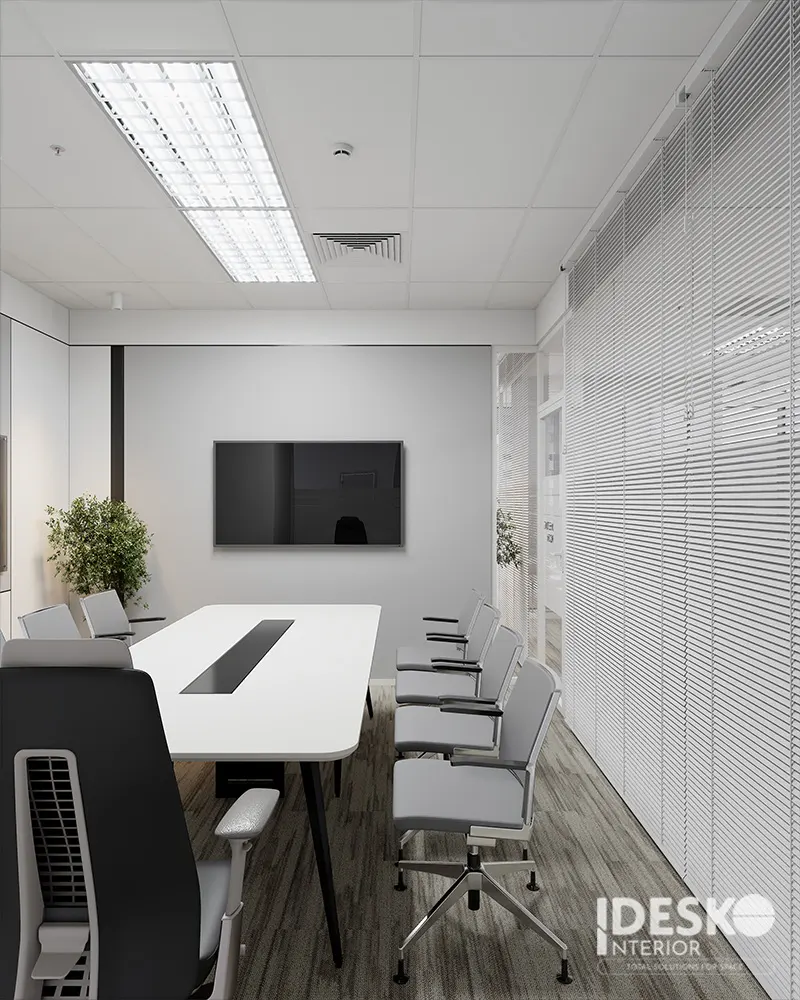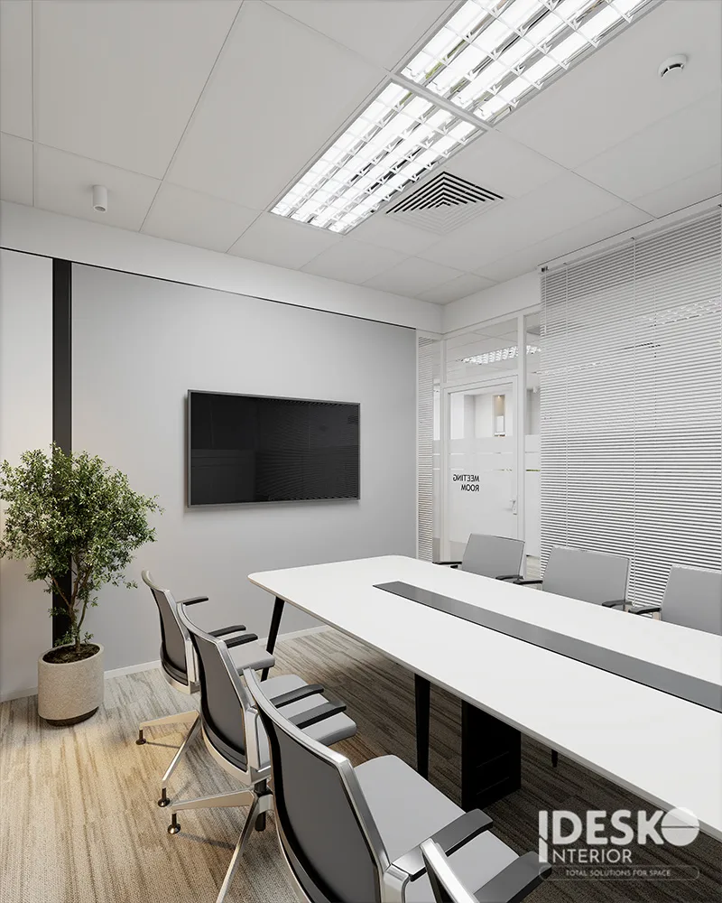 Hệ thống chiếu sáng trong phòng họp sử dụng đèn trần phân bố đều, bảo đảm ánh sáng ổn định trong suốt buổi họp. Màu tường xám nhạt kết hợp thảm sàn trung tính giúp giảm phản xạ ánh sáng, hỗ trợ mắt dễ chịu hơn khi phải theo dõi màn hình và tài liệu trong thời gian dài.
