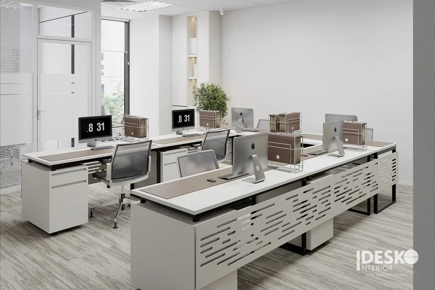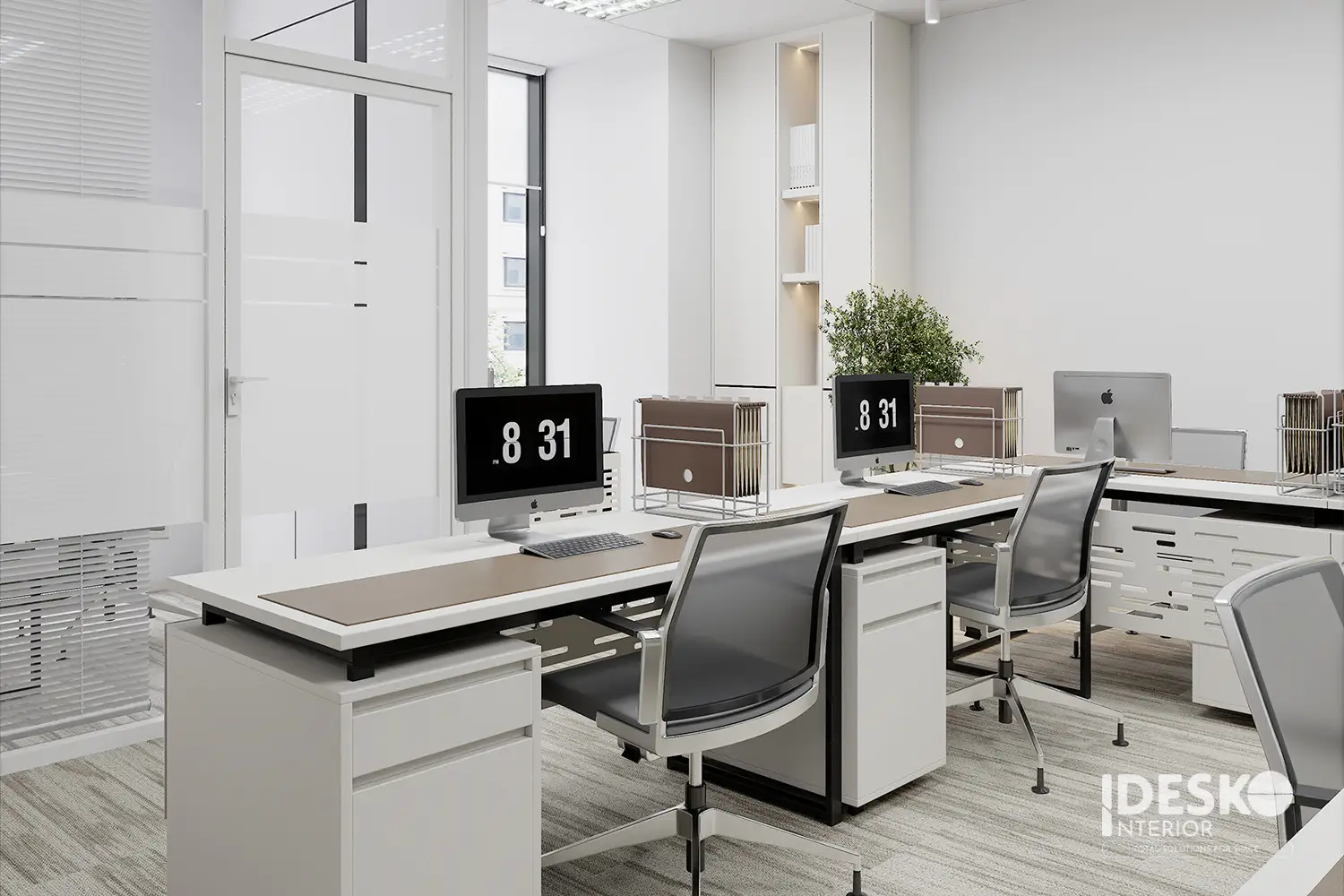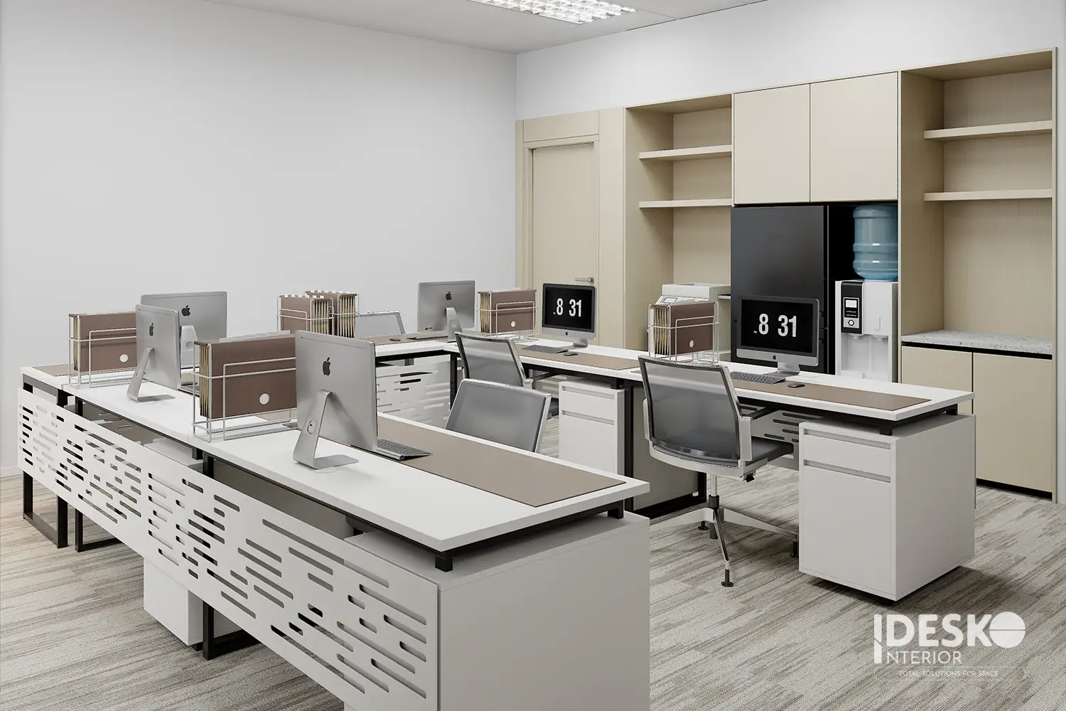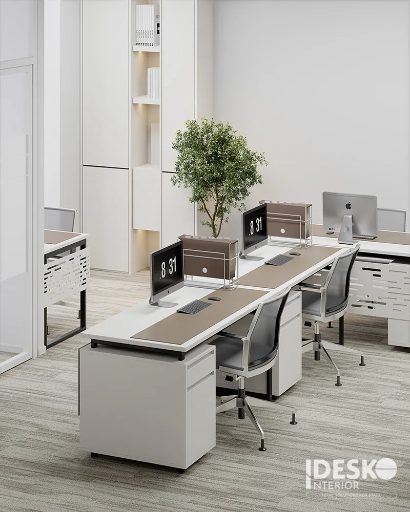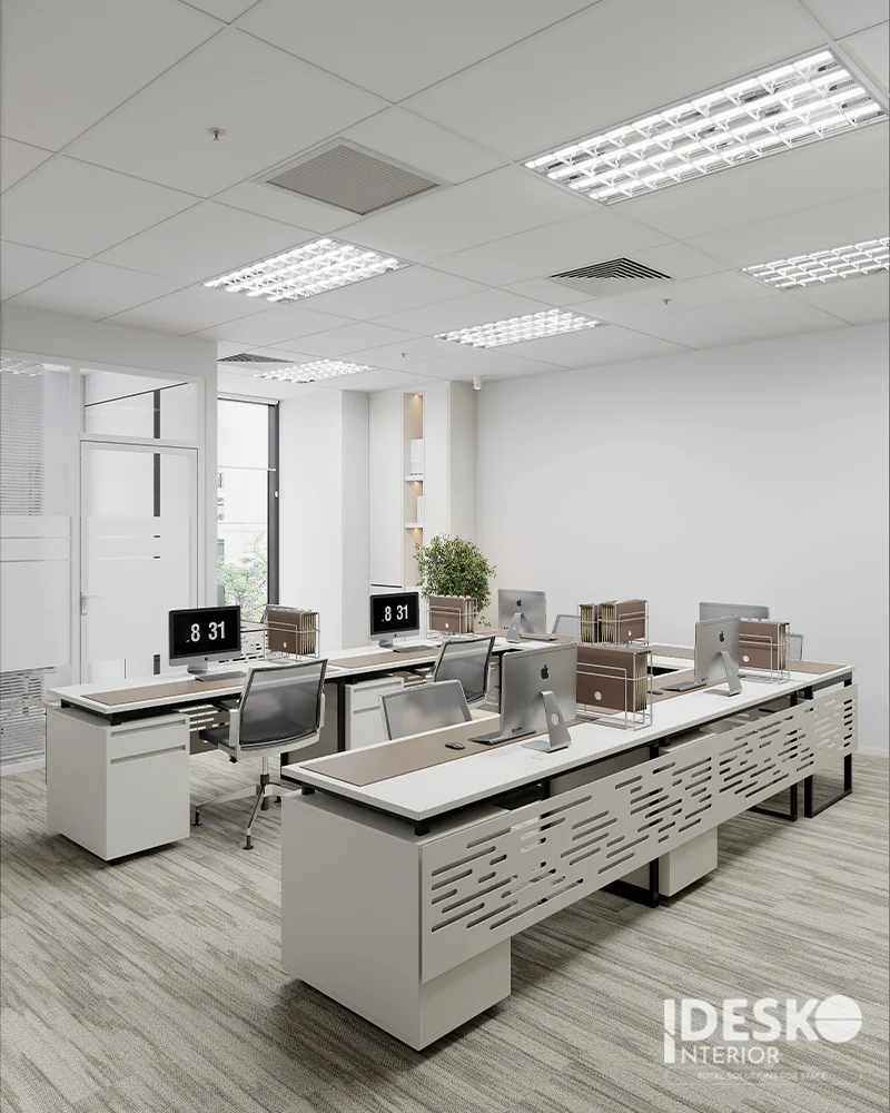 Đây là khu vực diễn ra phần lớn hoạt động hằng ngày của văn phòng. Idesko bố trí dãy bàn chữ U với nhiều chỗ ngồi, phù hợp mô hình làm việc theo nhóm. Cách tổ chức này tạo điều kiện để các thành viên trao đổi nhanh. Bàn màu trắng kết hợp dải nâu ở giữa giúp định vị khu vực đặt màn hình, bàn phím và tài liệu, nhờ đó tổng thể nhìn gọn và dễ sử dụng.