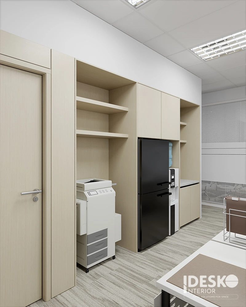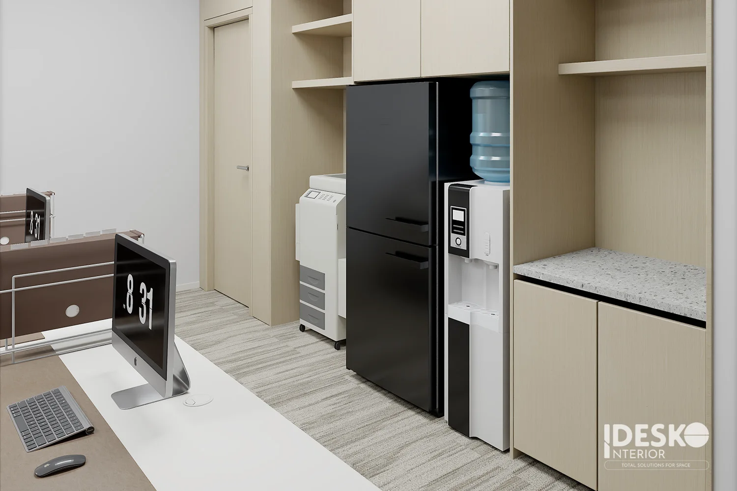 Khu pantry được thiết kế dọc theo một mảng tường, kết hợp tủ kệ cao, tủ lạnh, bình nước và máy in. Các thiết bị thường dùng được đặt ở vị trí vừa tầm với, hỗ trợ nhân sự thao tác nhanh trong giờ làm việc. Việc gộp các chức năng phụ như lưu trữ vật dụng, chuẩn bị đồ uống và in ấn vào cùng một dải giúp khu làm việc chính không bị chia nhỏ. Nhân sự chỉ cần di chuyển trong một phạm vi nhất định là có thể đáp ứng hầu hết nhu cầu hỗ trợ hằng ngày.
