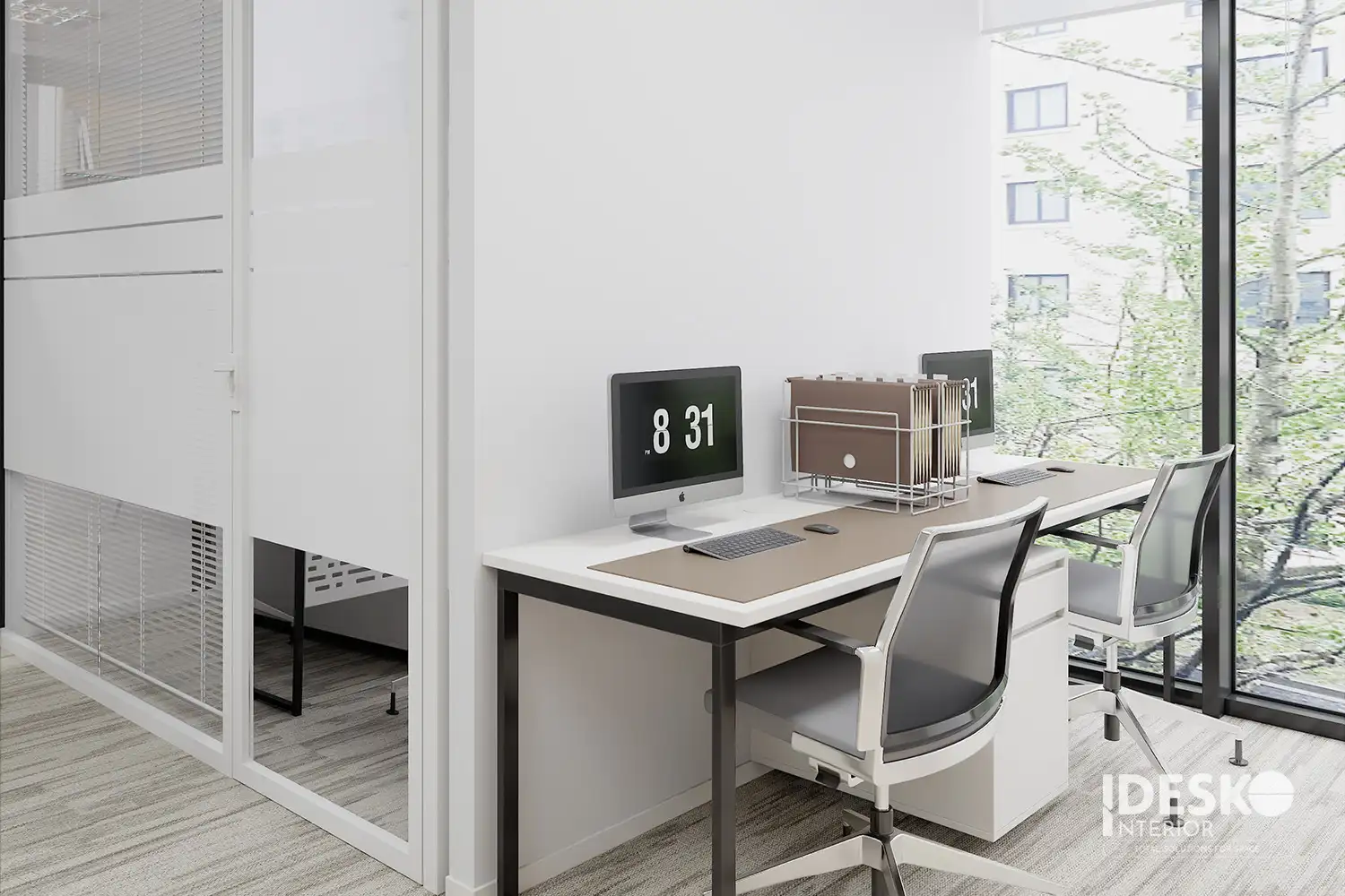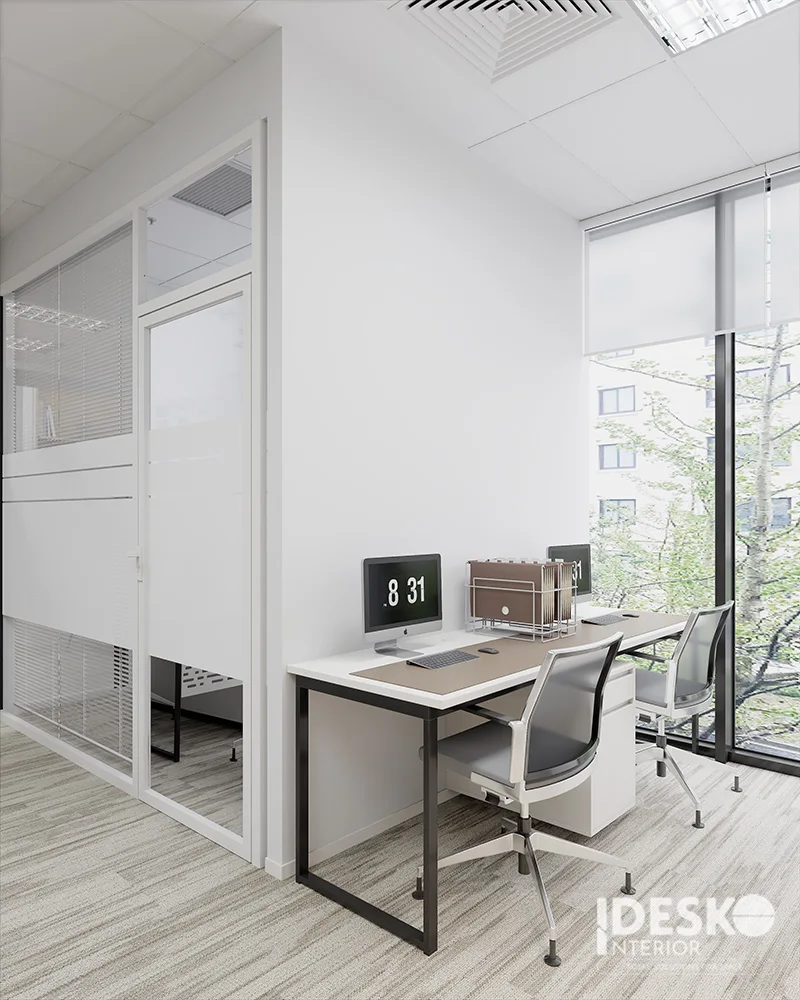 Các vách ngăn thấp hỗ trợ giảm xao nhãng nhưng vẫn giữ tầm nhìn thoáng, kết hợp ghế xoay có đệm để làm việc lâu không bị mỏi. Ở một góc riêng, Idesko bổ sung thêm cụm bàn đôi dành cho các vị trí cần tập trung hơn hoặc thường xuyên liên hệ với đối tác. Khu vực này vẫn kết nối trực quan với không gian chính, nên khi cần trao đổi vẫn rất thuận tiện.