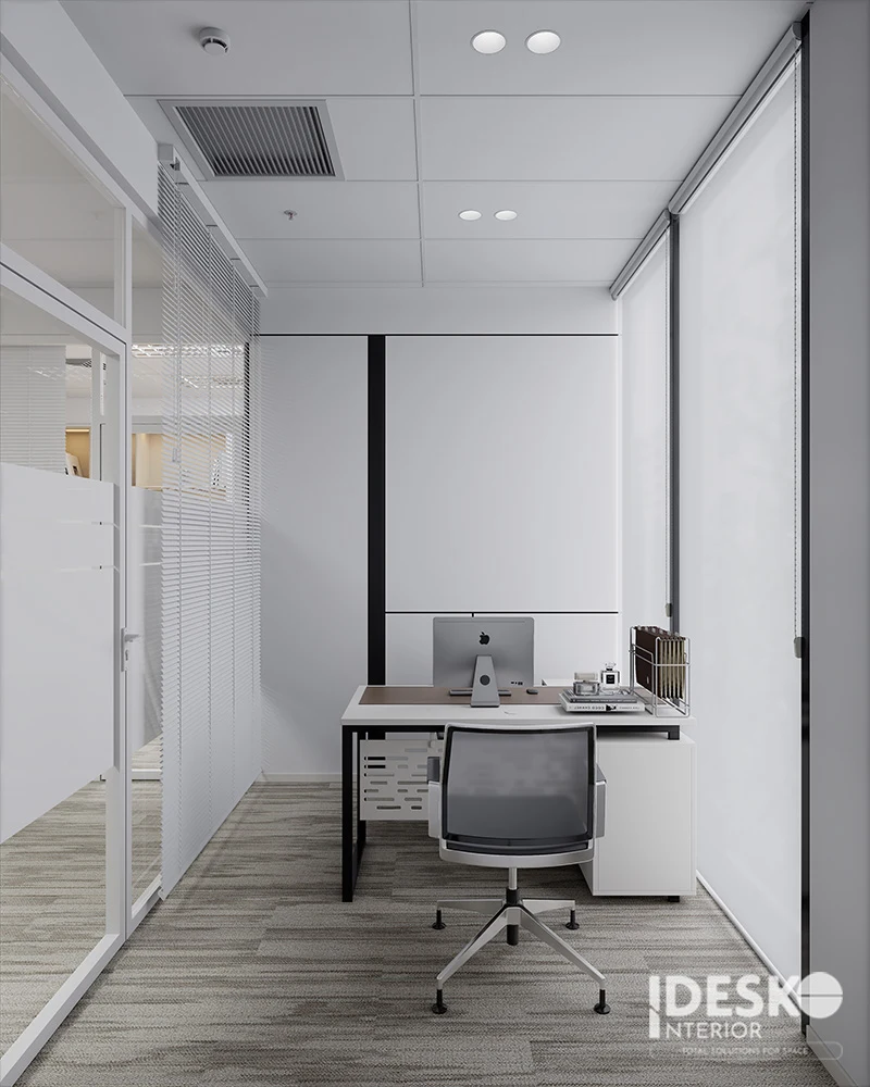Phòng trưởng phòng được thiết kế dành cho một người làm việc, với diện tích vừa phải nhưng bố cục rõ ràng. Bàn làm việc đặt sát tường, tạo tầm nhìn thuận tiện để quan sát khu làm việc chung. Cách bố trí này giúp người quản lý dễ nắm bắt hoạt động xung quanh mà vẫn giữ được sự tập trung cần thiết. Nội thất, vật liệu và màu sắc được đồng bộ với khu làm việc chung, duy trì sự liên kết trong toàn bộ văn phòng.