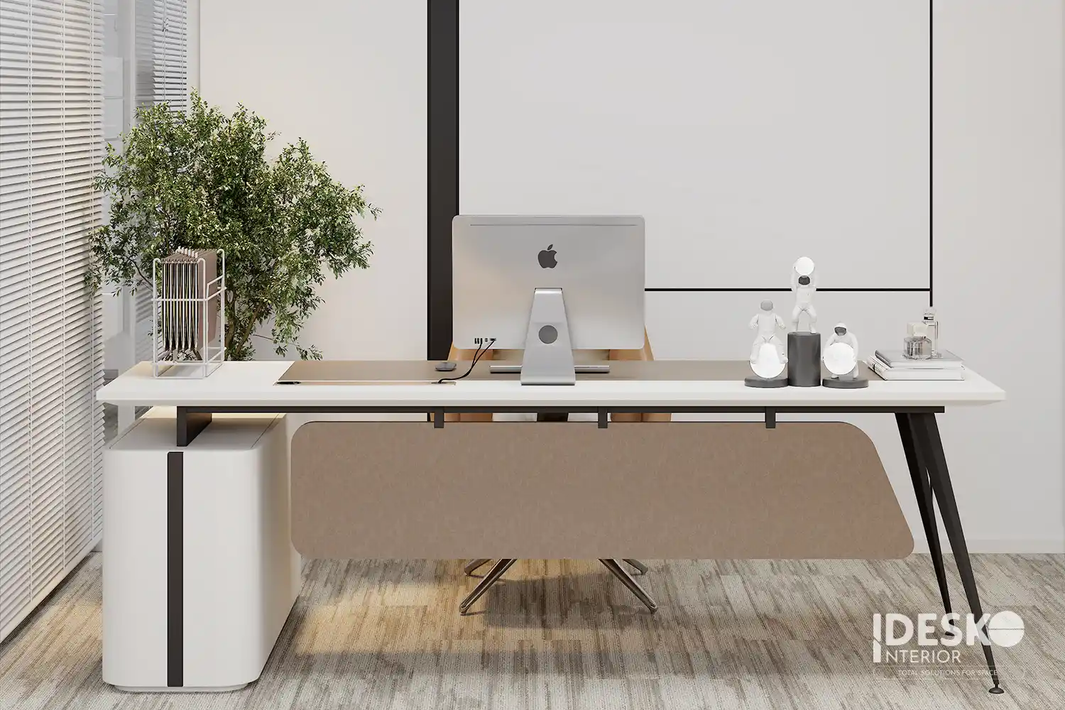 Khu bàn làm việc sử dụng một chiếc bàn dài với mặt bàn sáng màu và điểm nhấn ở dải trung tâm. Ghế giám đốc tông nâu tạo cảm giác ổn định và phù hợp với tông màu tổng thể. Bên cạnh bàn là hệ tủ trưng bày kết hợp tủ lưu trữ, trong đó các ô kệ mở có thể dùng để đặt sách, tài liệu hoặc những vật phẩm trang trí.