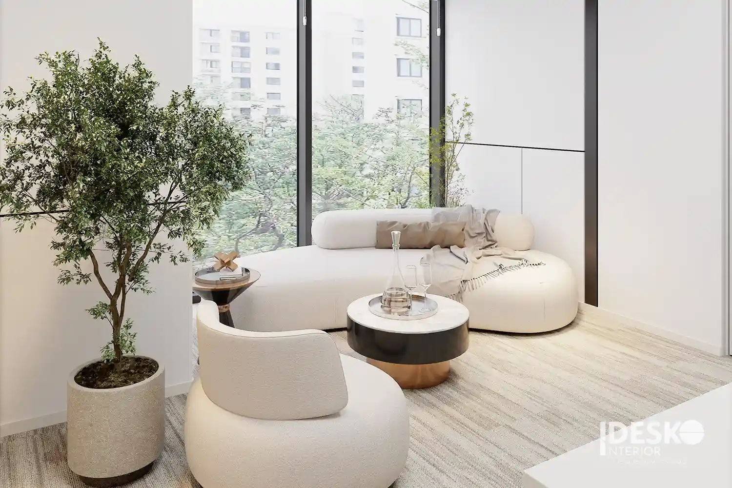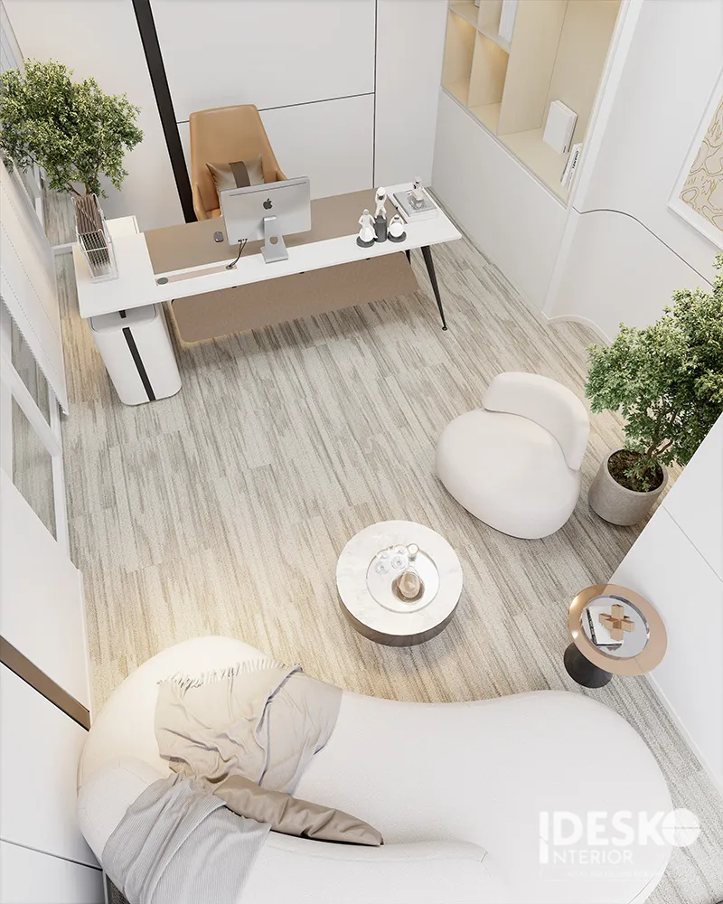 Không gian tiếp khách bố trí bộ sofa sáng màu cùng bàn trà mặt đá. Vị trí đặt sofa cho phép vừa tiếp khách, vừa quan sát được không gian bên ngoài phòng. Cây xanh được thêm vào ở các góc để tạo điểm nhấn và hỗ trợ cảm giác thư thái khi trao đổi công việc, đồng thời vẫn giữ lối đi rõ ràng trong phòng.