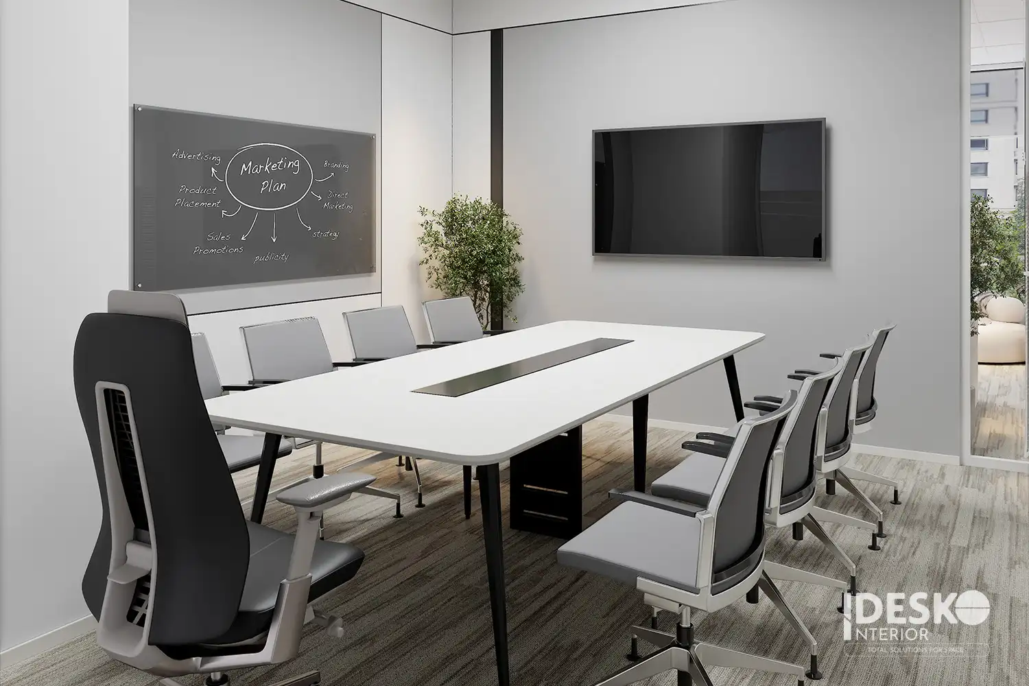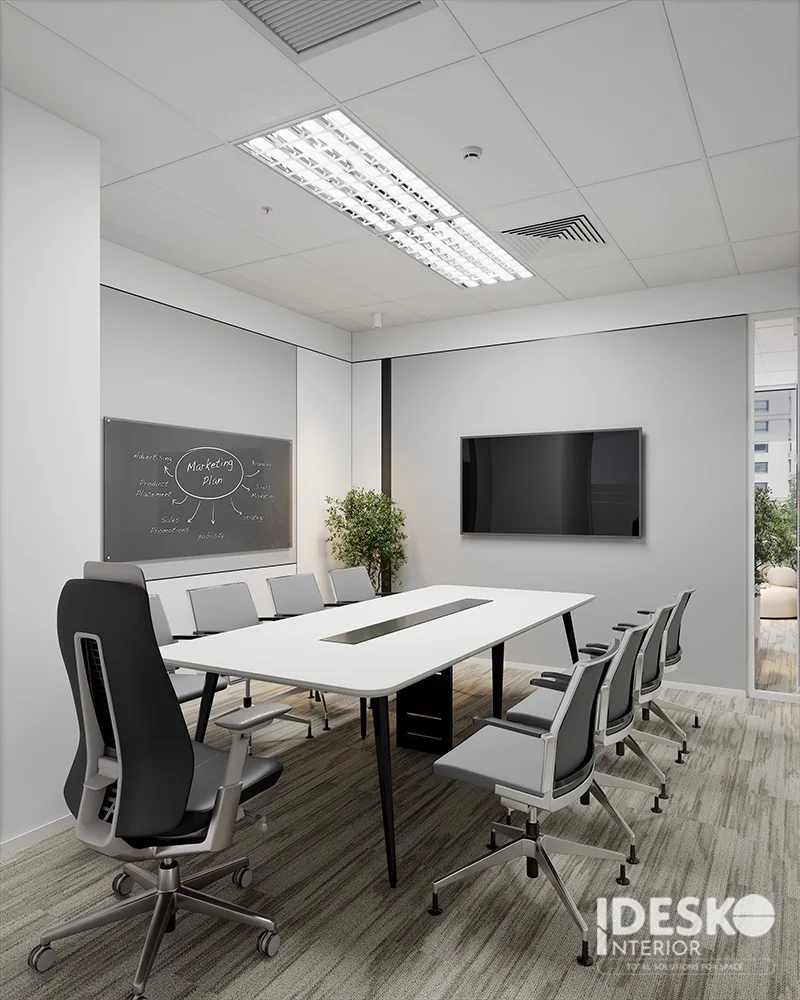 Trên một mảng tường, màn hình TV cỡ lớn được lắp đặt để phục vụ thuyết trình và họp trực tuyến. Ở phía còn lại, bảng viết hỗ trợ ghi chú nhanh hoặc xây dựng ý tưởng trong các phiên làm việc nhóm. Một chậu cây được đặt ở góc phòng để tạo điểm nhìn mềm hơn trong không gian có nhiều bề mặt phẳng.