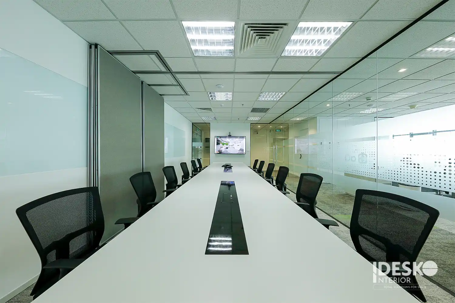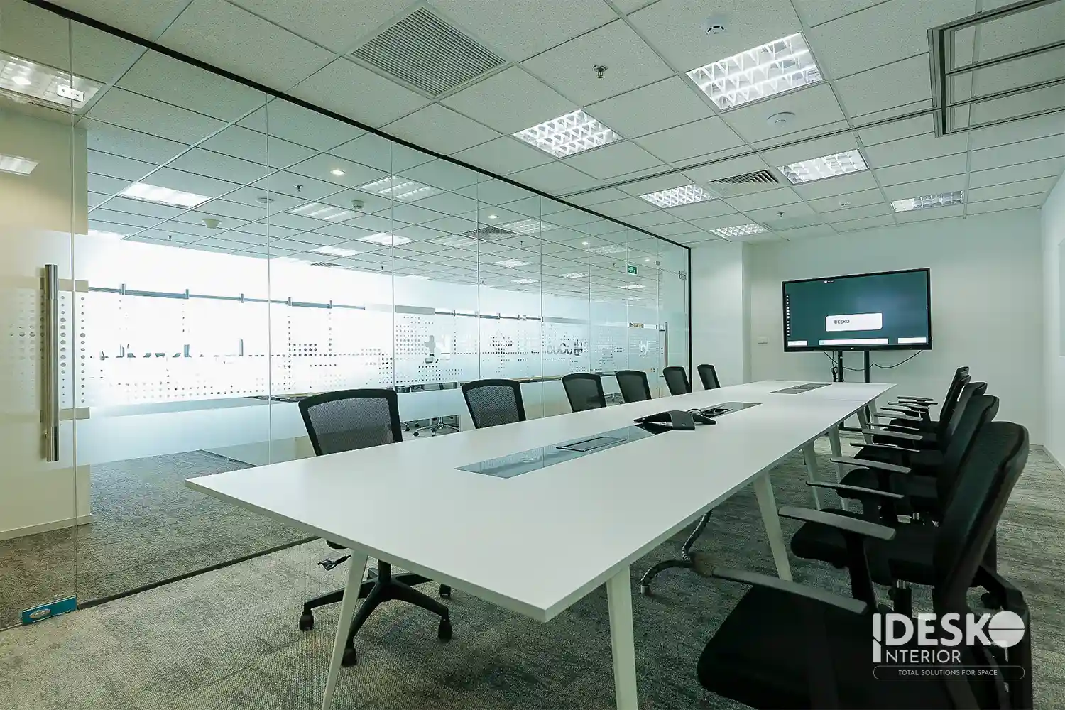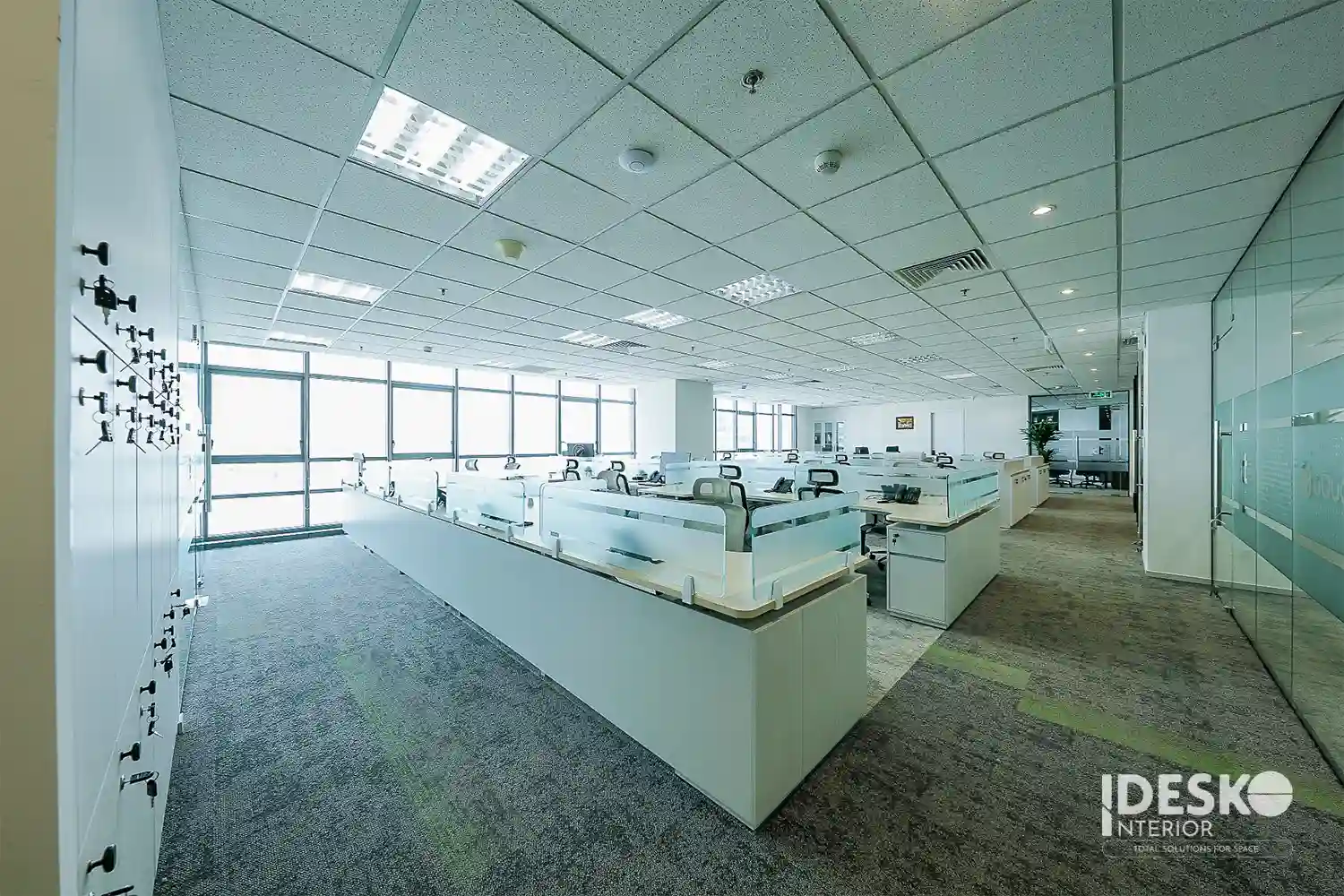 Văn phòng lần này Idesko thiết kế là sự kết hợp của 2 văn phòng công ty KT DX & AQUA RETAIL. Mang phong cách thiết kế đơn giản, hiện đại. Vật liệu sàn thảm tấm với các đường line màu xanh làm điểm nhấn. Nội thất gỗ công nghiệp màu trắng làm cho văn phòng rộng rãi. Phòng họp lớn với vách ngăn di động dễ dàng ngăn thành 2 phòng họp nhỏ phù hợp với nhu cầu sử dụng.