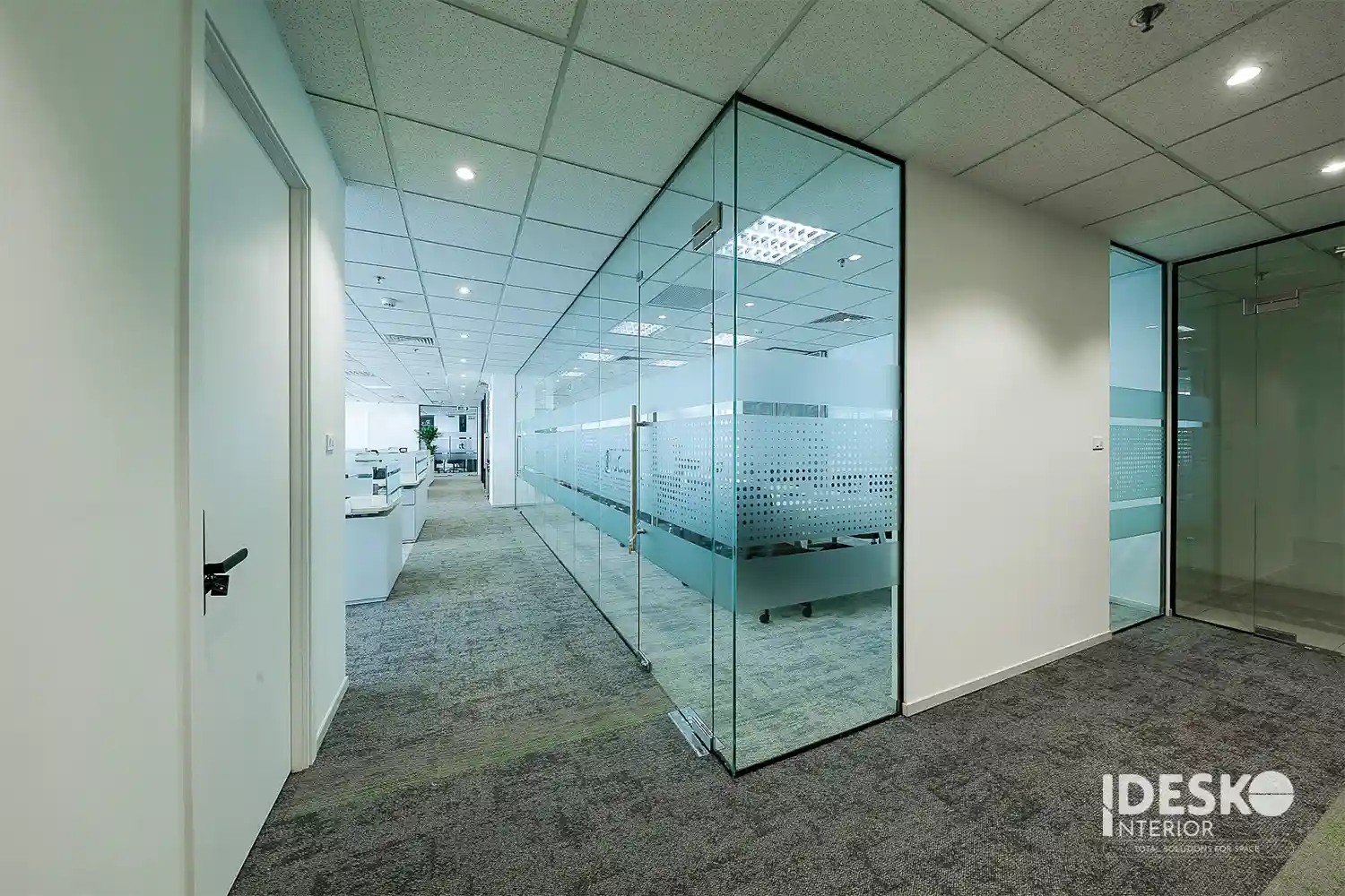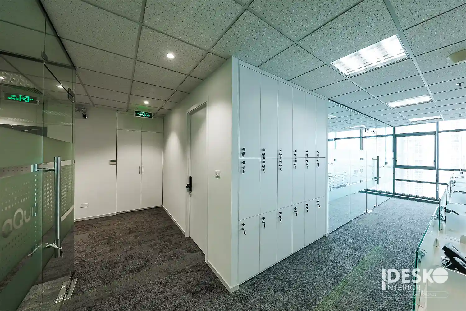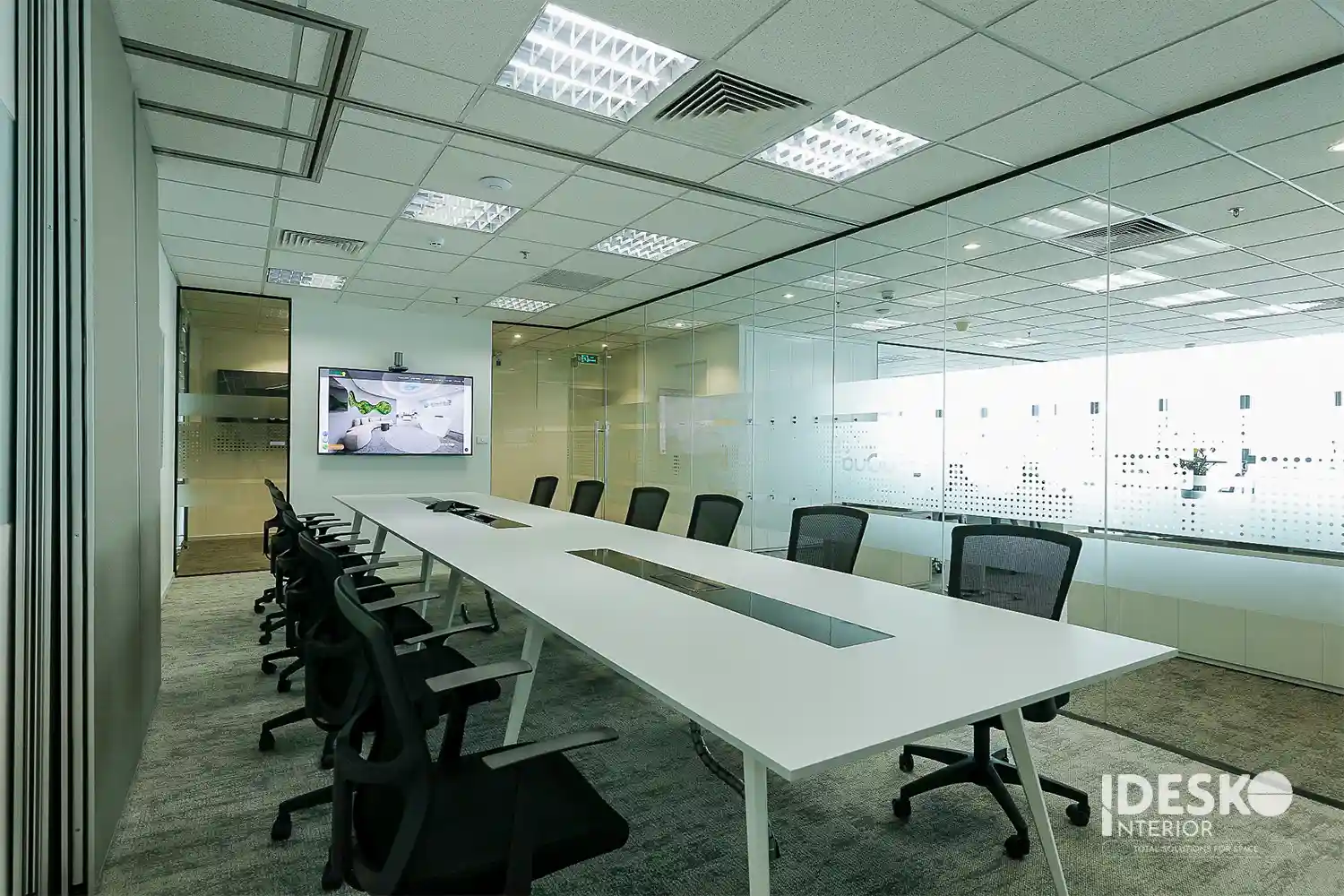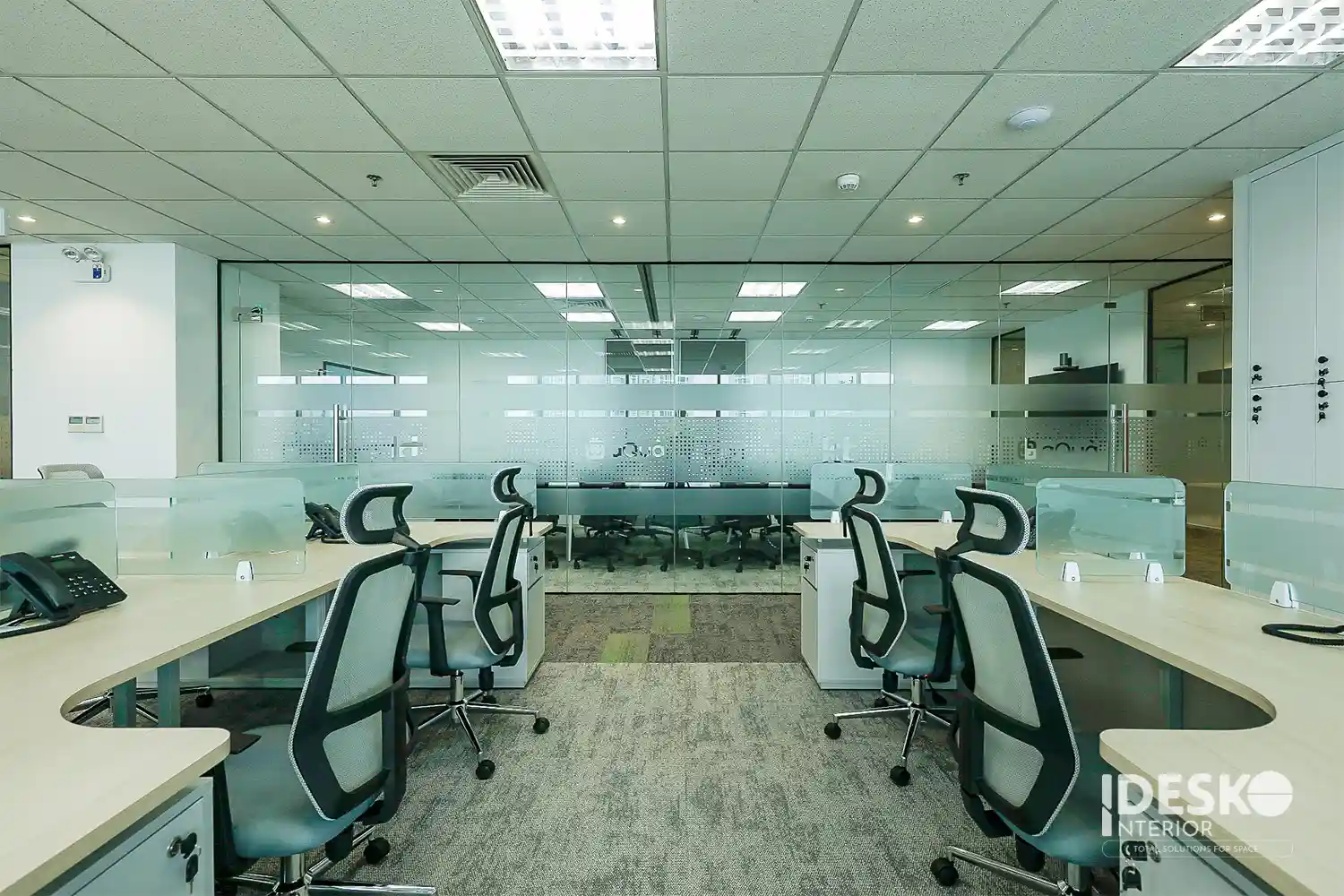 Văn phòng lần này Idesko thiết kế là sự kết hợp của 2 văn phòng công ty KT DX & AQUA RETAIL. Mang phong cách thiết kế đơn giản, hiện đại. Vật liệu sàn thảm tấm với các đường line màu xanh làm điểm nhấn. Nội thất gỗ công nghiệp màu trắng làm cho văn phòng rộng rãi. Phòng họp lớn với vách ngăn di động dễ dàng ngăn thành 2 phòng họp nhỏ phù hợp với nhu cầu sử dụng.