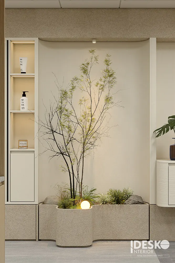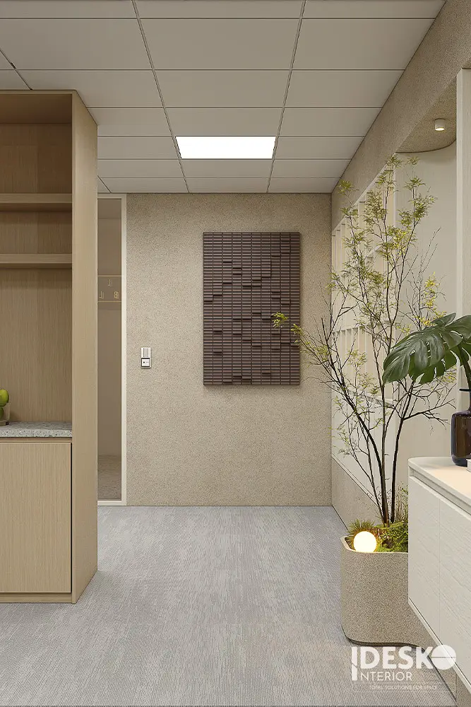 Cây xanh xuất hiện ở mọi khu vực quan trọng: quầy lễ tân, khu pantry, phòng họp và phòng giám đốc. Việc đưa thiên nhiên vào không gian làm việc đã được chứng minh giúp giảm stress và tăng hiệu suất làm việc.