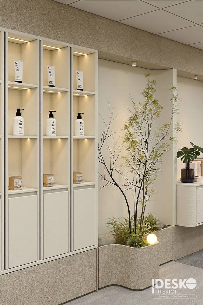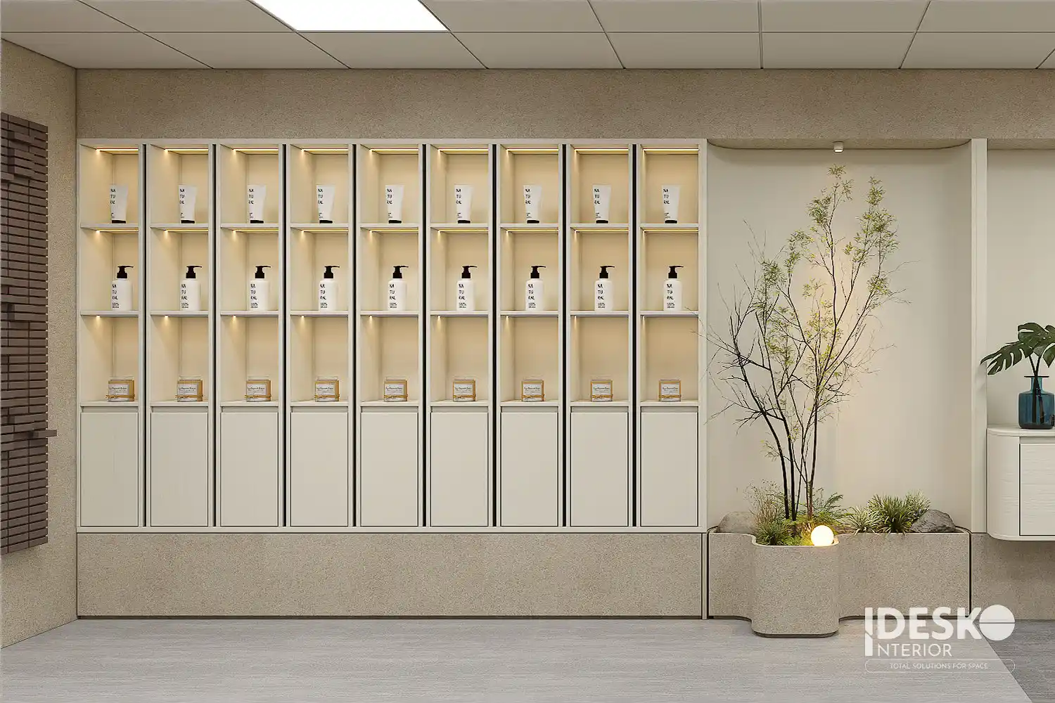 Đây là bộ mặt của công ty, nơi gây ấn tượng đầu tiên với đối tác và khách hàng. Quầy lễ tân được thiết kế tối giản, gọn gàng, với vách logo thương hiệu Lubylab trang trọng phía sau. Điểm nhấn đặc biệt và thông minh nhất tại đây chính là hệ tủ kệ trưng bày sản phẩm. Nó không chỉ là khu vực lưu trữ mà còn là một “showroom” thu nhỏ, thể hiện niềm tự hào và tính chuyên nghiệp của thương hiệu. Mỗi ô trưng bày được bố trí đèn hắt riêng, biến từng sản phẩm trở thành một tác phẩm nghệ thuật. Thiết kế này khéo léo lồng ghép câu chuyện thương hiệu vào không gian kiến trúc một cách trực quan và hiệu quả.