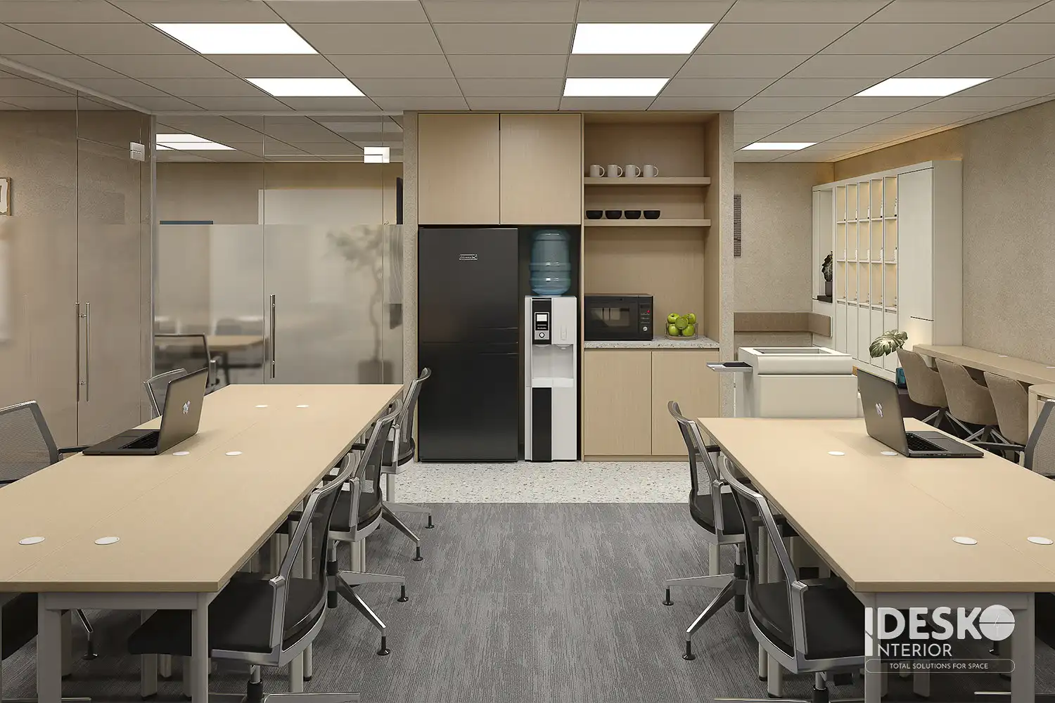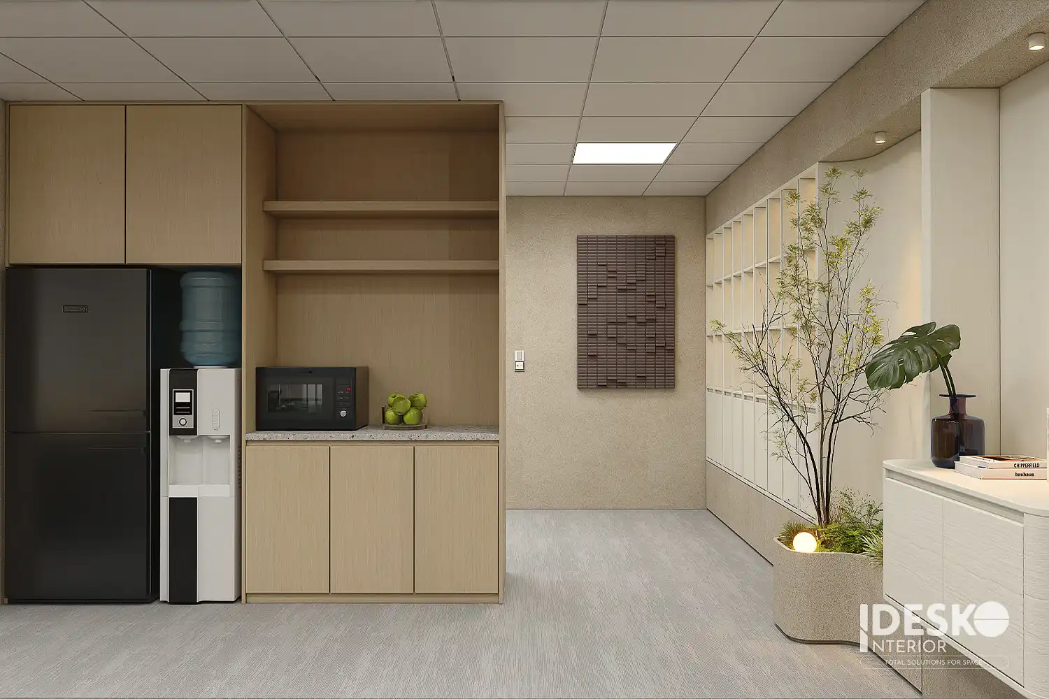 Pantry được tích hợp liền mạch với không gian chung, là nơi nhân viên có thể tái tạo năng lượng với đầy đủ tiện nghi như tủ lạnh, máy lọc nước, lò vi sóng. Thiết kế bồn cây xanh khéo léo vừa làm vách ngăn, vừa mang mảng xanh thiên nhiên vào văn phòng. Chi tiết này thể hiện sự quan tâm của doanh nghiệp đến sức khỏe tinh thần của nhân viên.