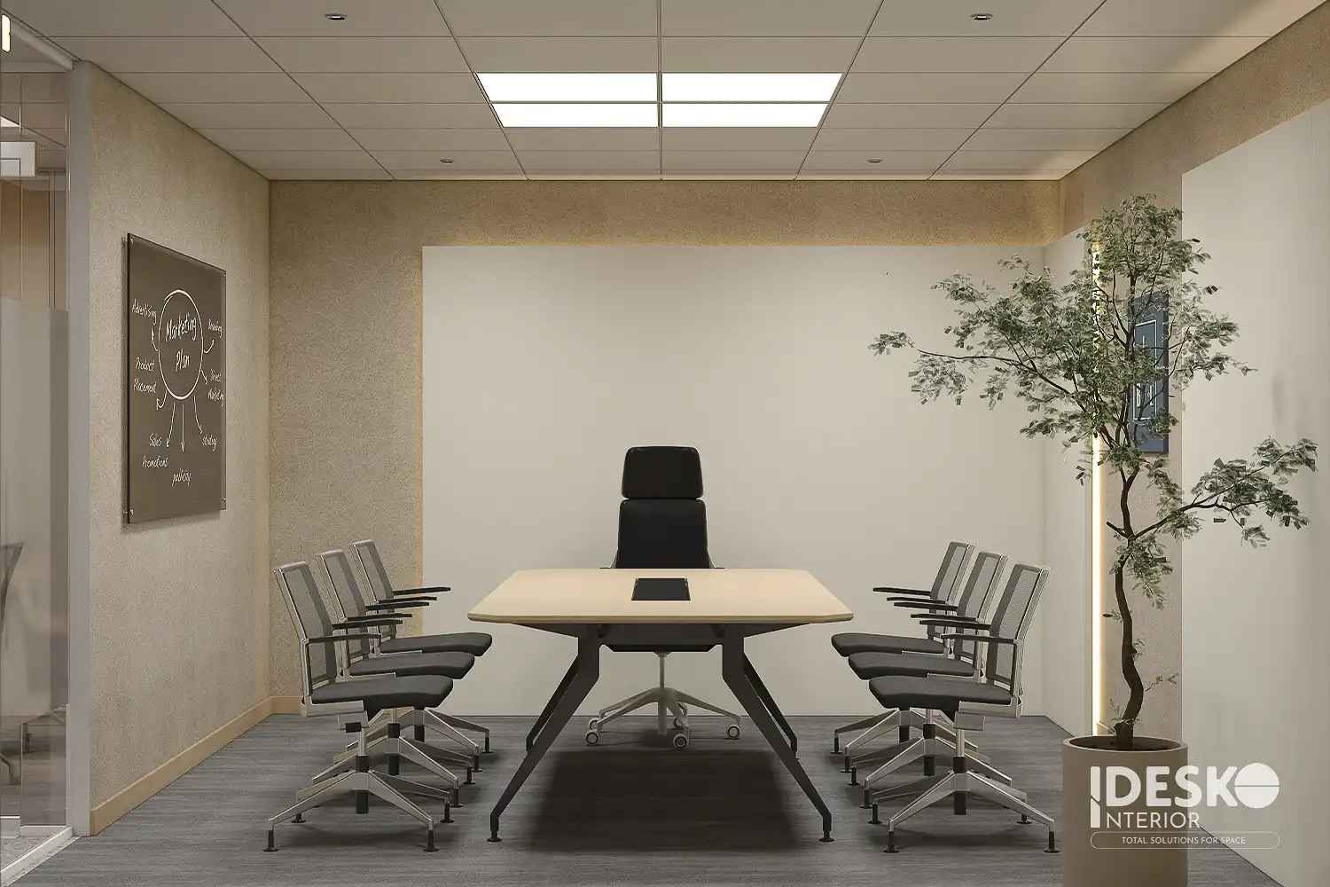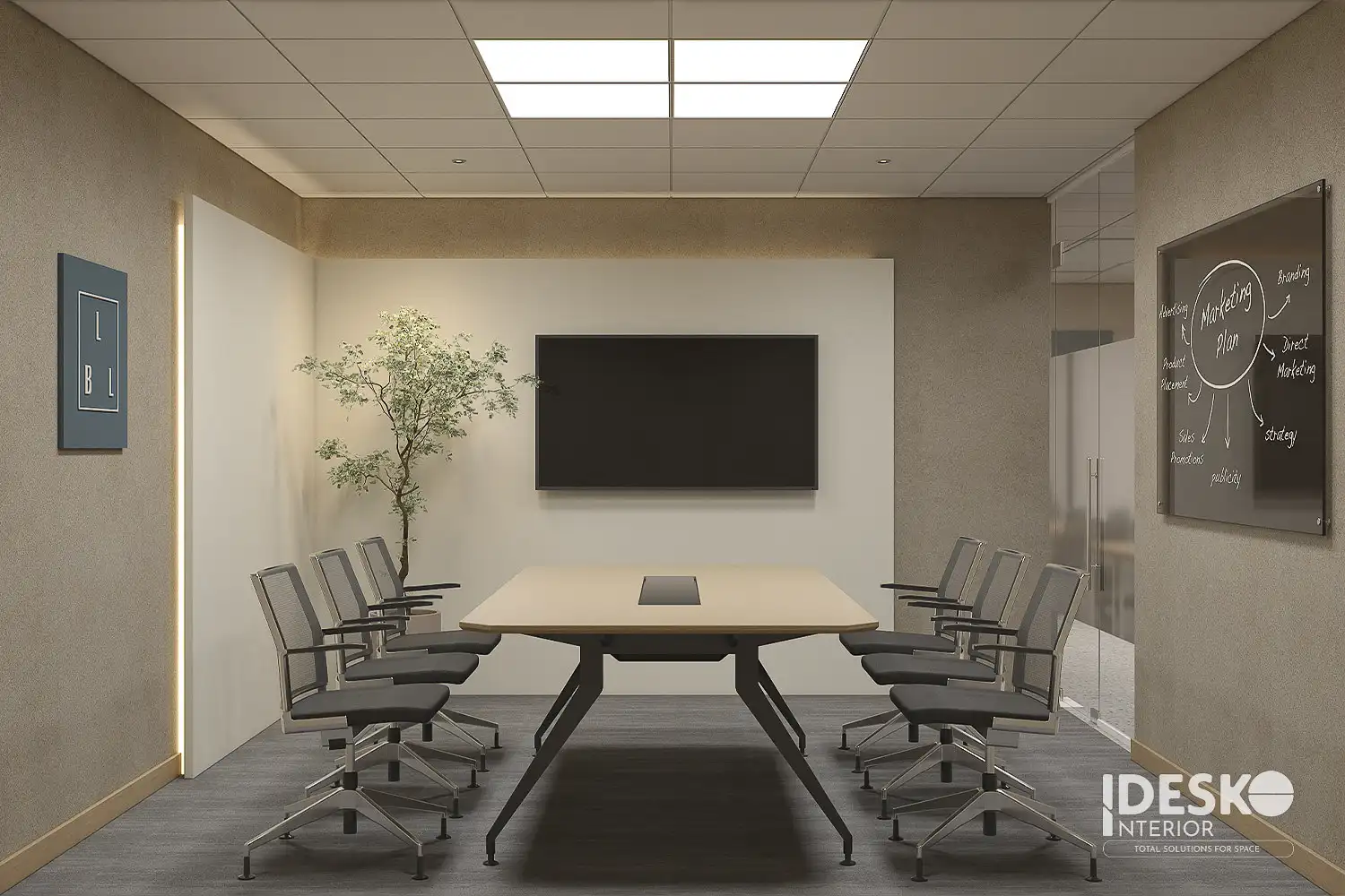 Phòng họp chung có đầy đủ thiết bị công nghệ như màn hình lớn, bảng viết, đảm bảo các buổi họp diễn ra hiệu quả. Thiết kế nội thất tối giản, tập trung vào công năng. Việc sử dụng vách kính thể hiện văn hóa làm việc minh bạch và cởi mở. Trong khi đó, cây xanh giúp làm mềm không gian và giảm bớt sự khô cứng.