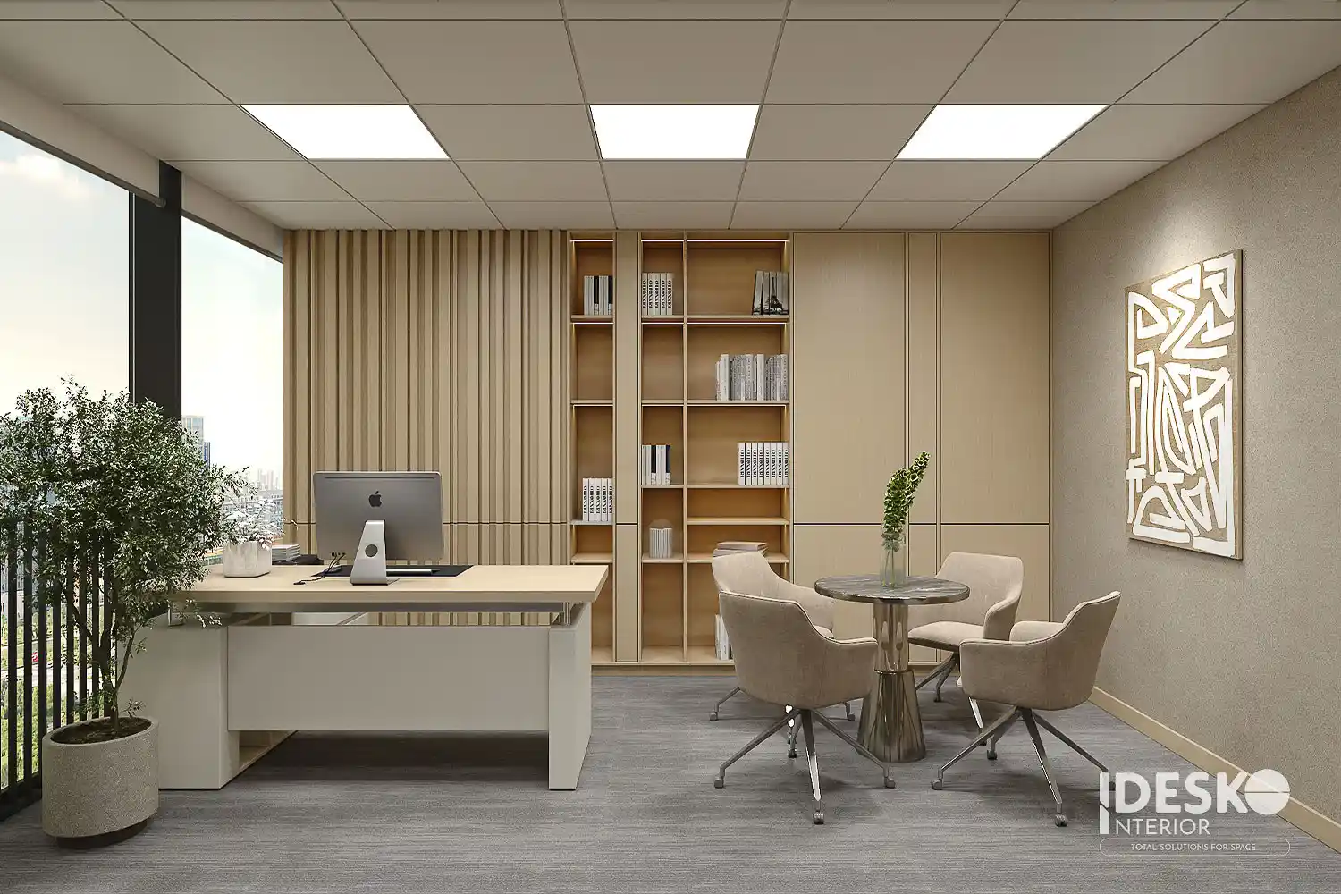Đây là không gian thể hiện rõ nhất sự sang trọng và tinh tế, với tầm nhìn thoáng đãng qua khung cửa kính lớn. Điểm nhấn của căn phòng nằm ở vách ốp gỗ sọc dọc kết hợp cùng hệ tủ sách lớn. Thiết kế này vừa mang lại cảm giác sang trọng, vừa tạo phông nền tri thức, khẳng định tầm vóc của người lãnh đạo.