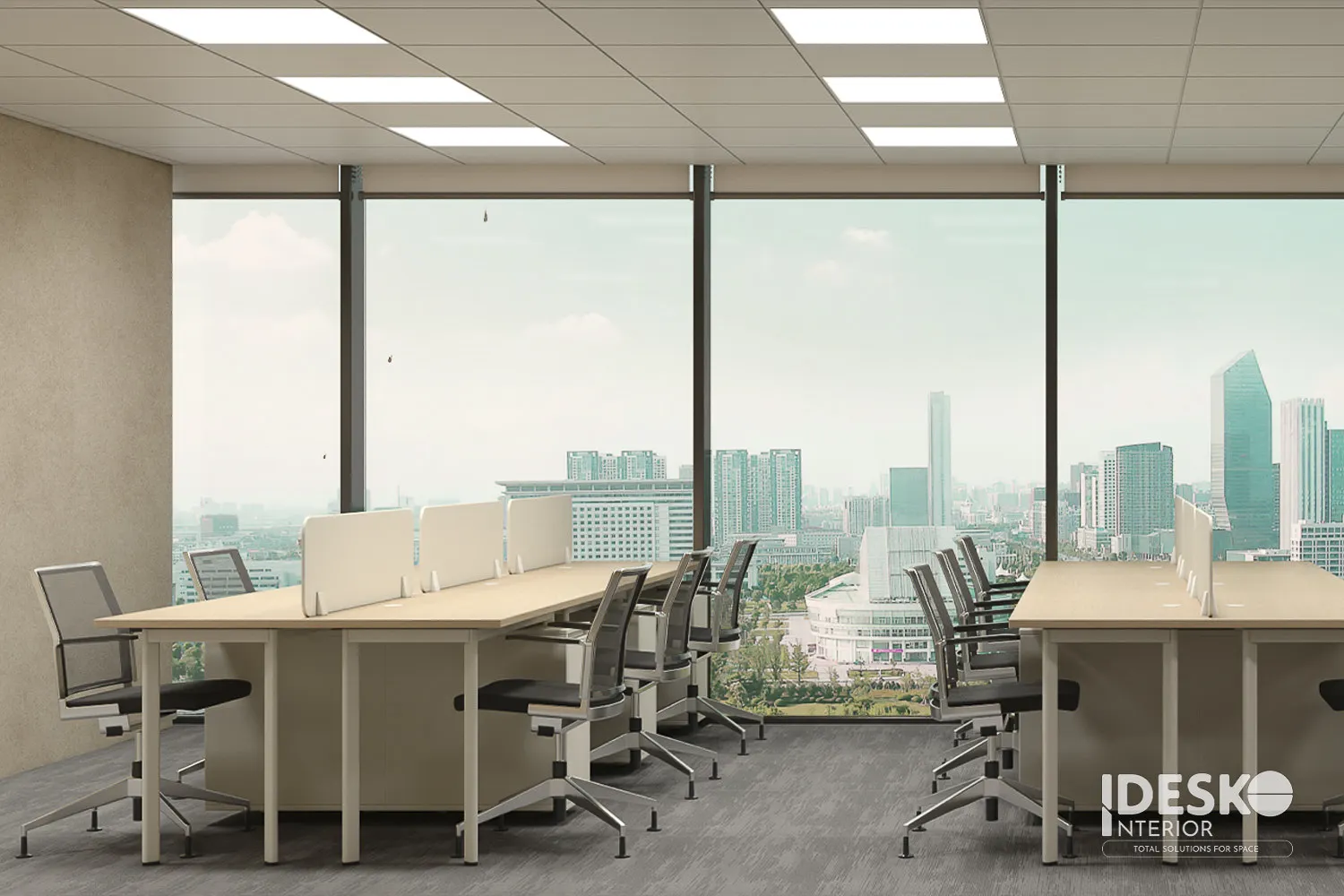 Được bố trí theo mô hình không gian mở, khu vực làm việc chung khuyến khích sự tương tác và giao tiếp giữa các nhân viên. Bàn làm việc được sắp xếp thành các dãy dài, tối ưu hóa diện tích. Việc lựa chọn nội thất đồng bộ với bàn màu gỗ sáng và ghế lưới đen giúp duy trì sự nhất quán trong phong cách. Vách kính trong suốt ngăn cách với phòng họp giúp không gian luôn có cảm giác kết nối và mở rộng.