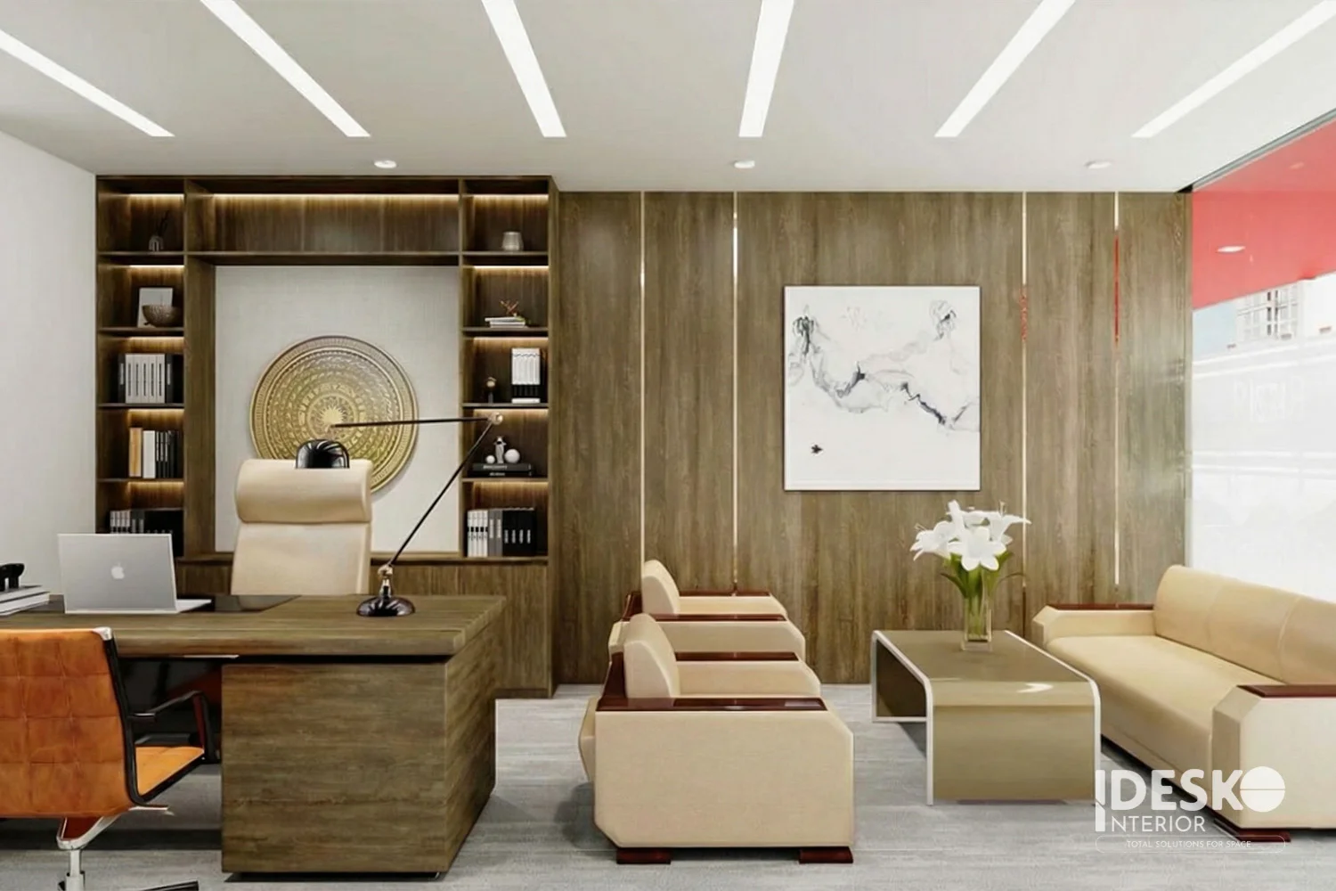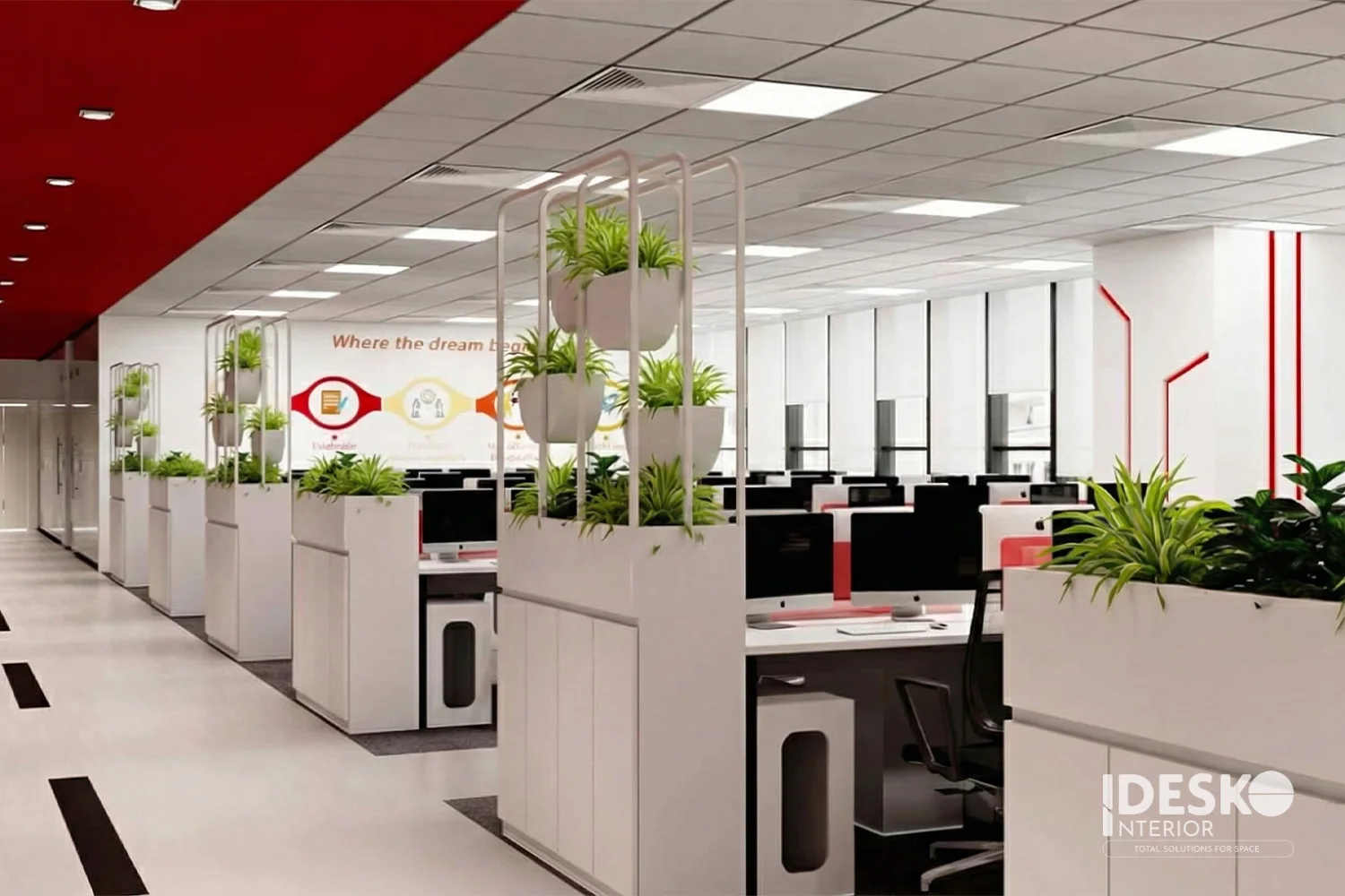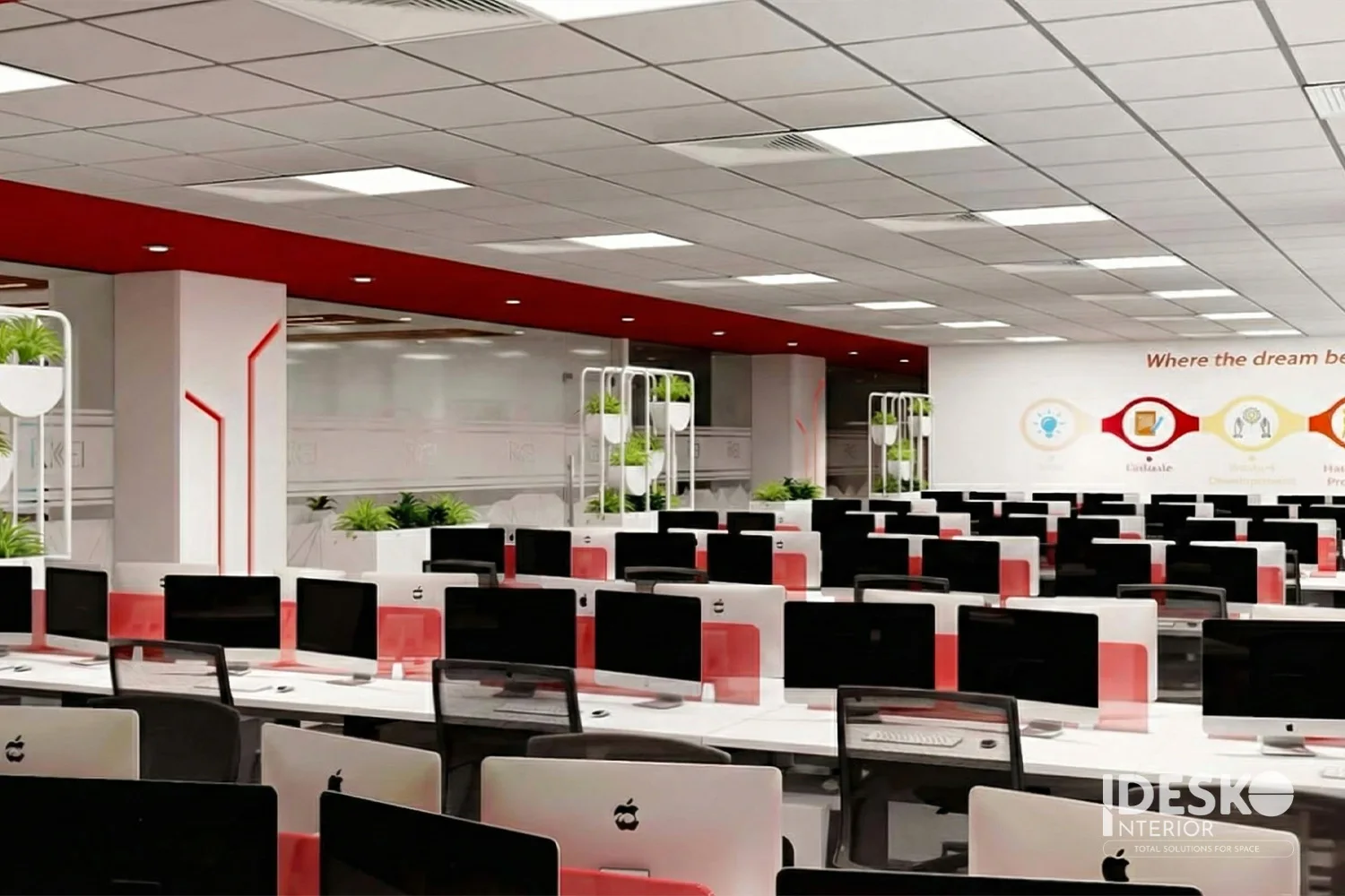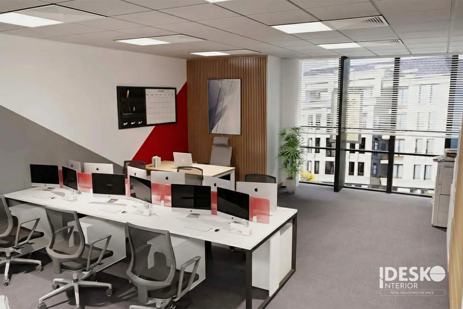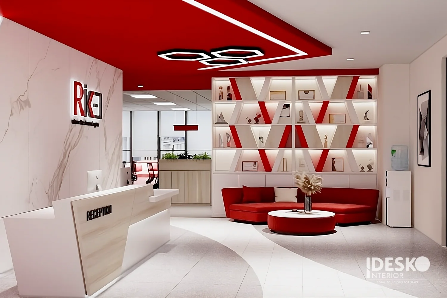 Thiết kế nội thất văn phòng công ty ngày càng được quan tâm. Ở văn phòng này, Idesko lấy ý tưởng từ màu đỏ – màu sắc nhận diện thương hiệu kết hợp với các tạo hình của vật liệu càng làm nổi bật hình ảnh của công ty. Một văn phòng hiện đại, đầy đủ tiện nghi. Sự kết hợp từ trần, sàn, tường đến đồ nội thất. Tất cả tạo nên một văn phòng làm việc hoàn hảo trong mắt nhân viên và các đối tác khách hàng.