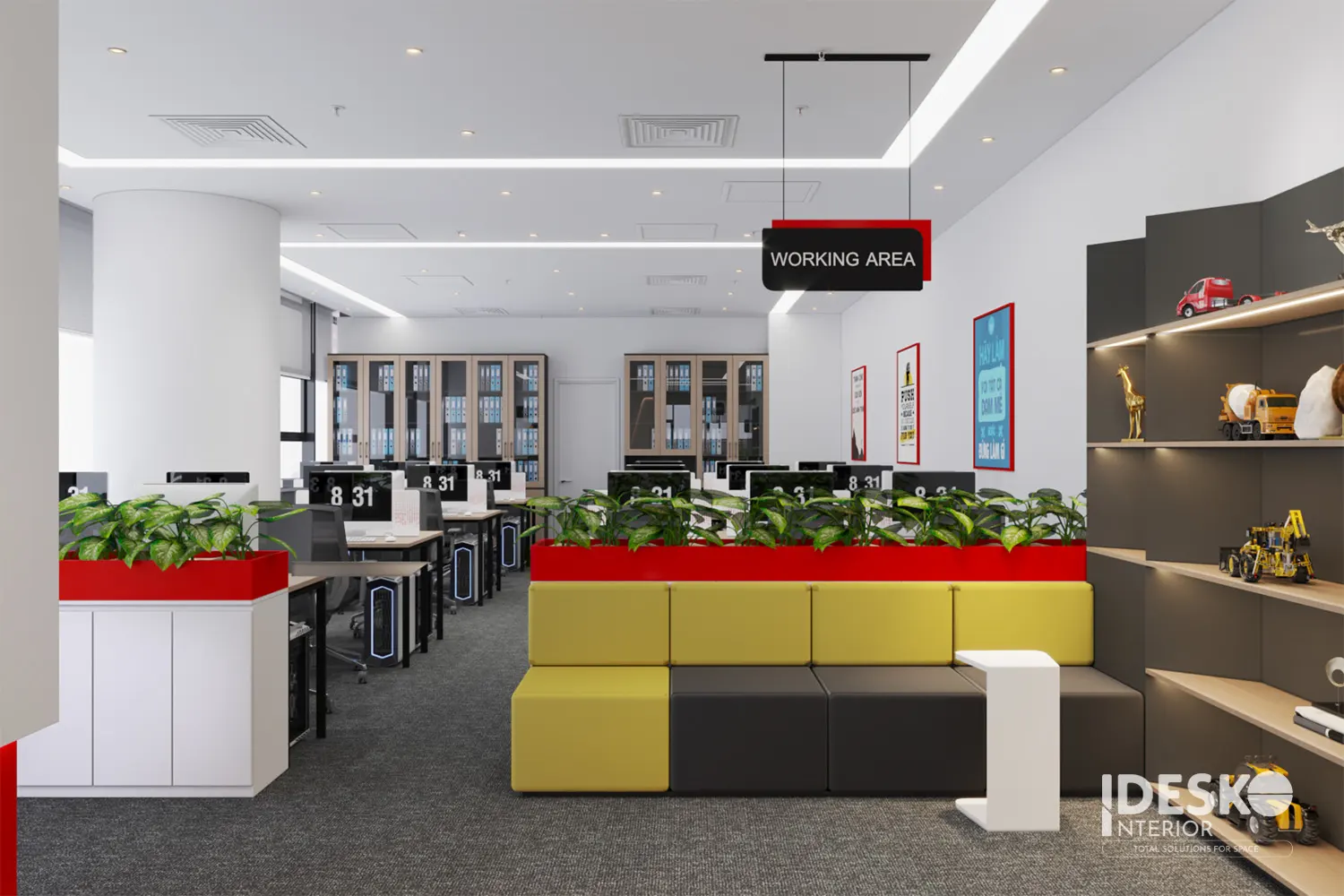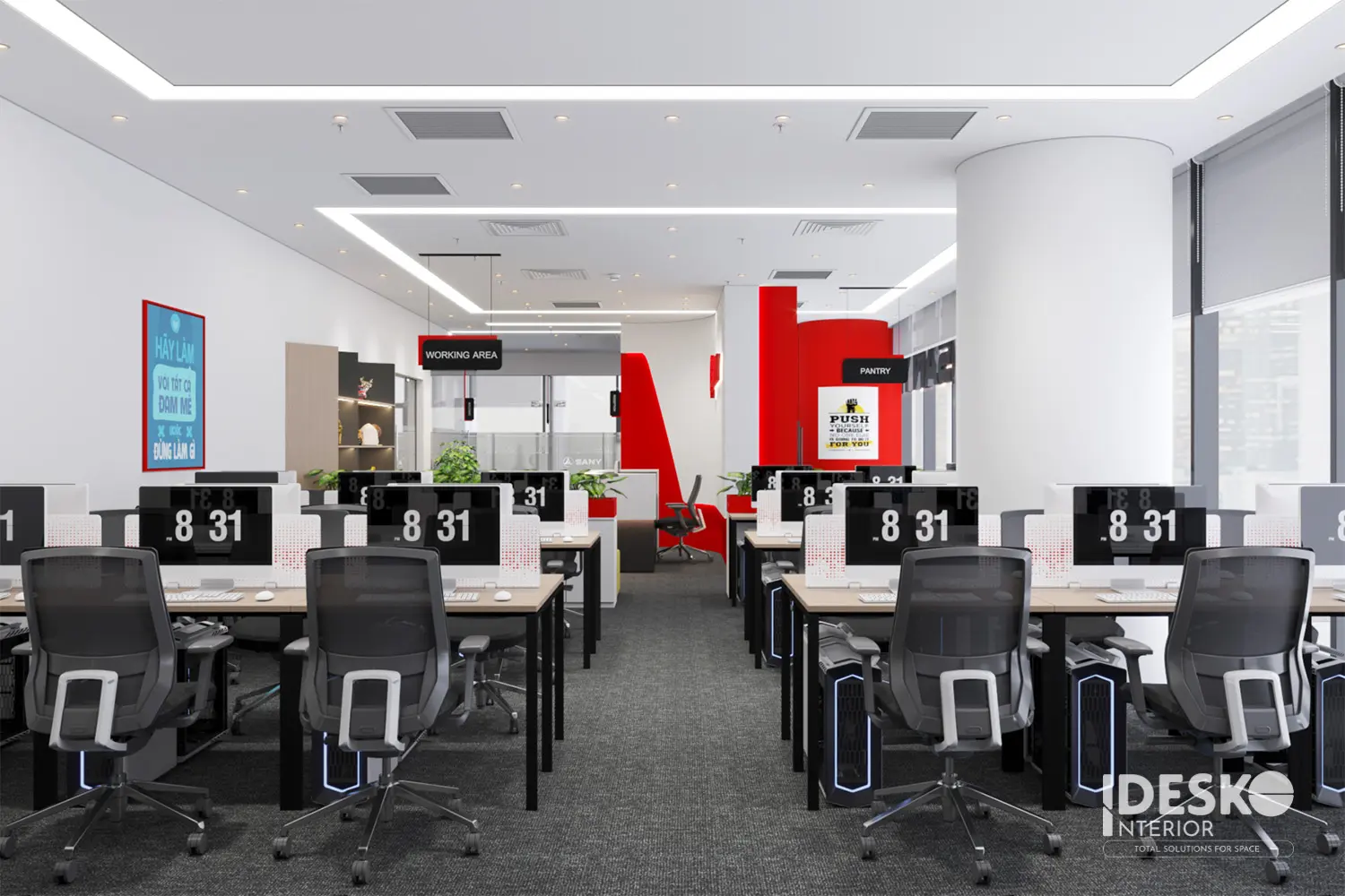 Vị trí thuận lợi, nằm trên con đường Phạm Văn Đồng với giao thông phát triển sầm uất tại Hà Nội. Tận dụng điều ấy, Idesko đã thiết kế văn phòng với không gian làm việc mở, các phòng chức năng đều có ánh sáng tự nhiên. Sự kết hợp màu sắc lấy màu nhận diện thương hiệu làm điểm nhấn tạo nên tổng thể hài hòa. Đặc biệt thiết kế logo hướng ra phía đường Phạm Văn Đồng đưa hình ảnh công ty đến gần hơn với mọi người.